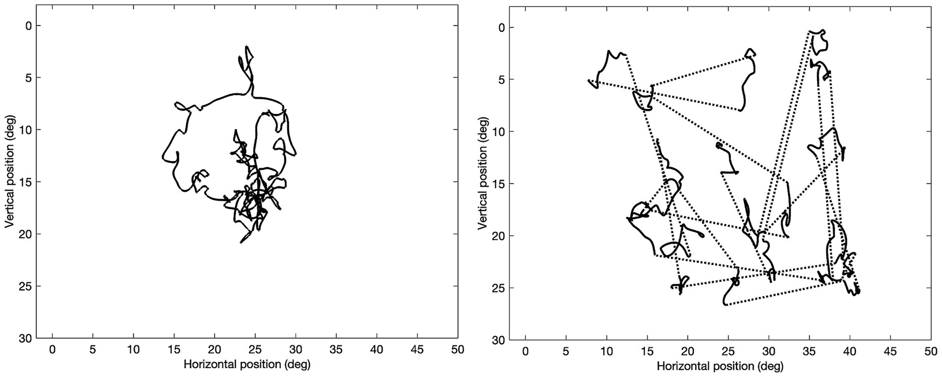 Figure 1. Example stimulus trajectories for a smooth pursuit trajectory (left) and saccadic pursuit trajectory (right). For the saccadic pursuit trajectory, the stimulus jumps are indicated by the dotted lines to note that the stimulus did not travel along these lines but simply disappeared in one location and reappeared in a new location. Note that each trajectory set consists of three saccadic pursuit trajectories, together sampling the entire visual field (Humphrey Field Analyzer 24–2 test locations).