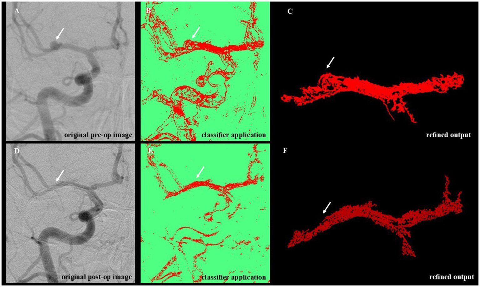Workflow for WEKA-Based segmentation and denoising of angiographic images. This figure illustrates the sequential steps of the image analysis pipeline applied to preoperative and postoperative DSA images. (A) Original preoperative image showing unprocessed vascular anatomy with visible aneurysmal dilation (white arrow). (B) Machine learning–based segmentation using the trained WEKA classifier highlights vascular structures and the aneurysmal region. (C) Post-processing of the segmented image (denoising) removes background artifacts and isolates the target vascular segment. (D) Original postoperative angiographic image acquired following aneurysm treatment. (E) Application of the trained classifier to the postoperative image, enabling direct comparison with the preoperative segmentation. (F) Refined output after denoising, showing the treated vessel segment. The aneurysmal dilation visible preoperatively (top row) is absent in the postoperative segmentation (bottom row), indicating successful obliteration.