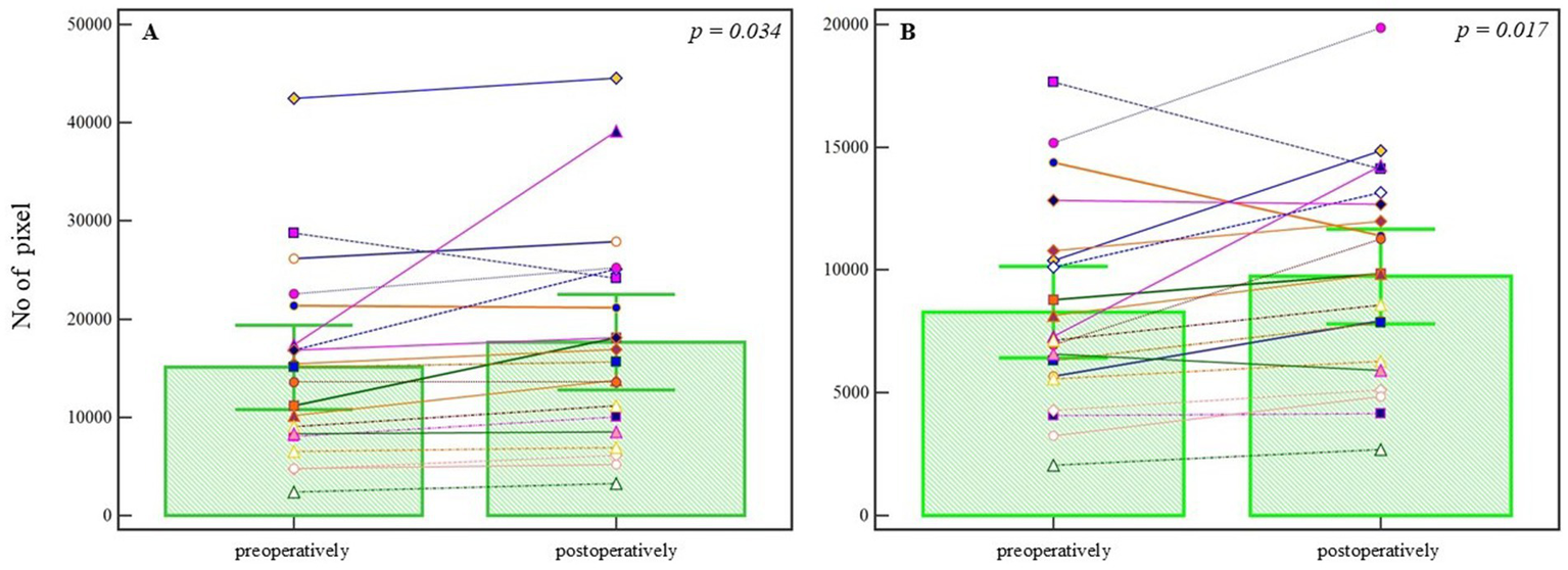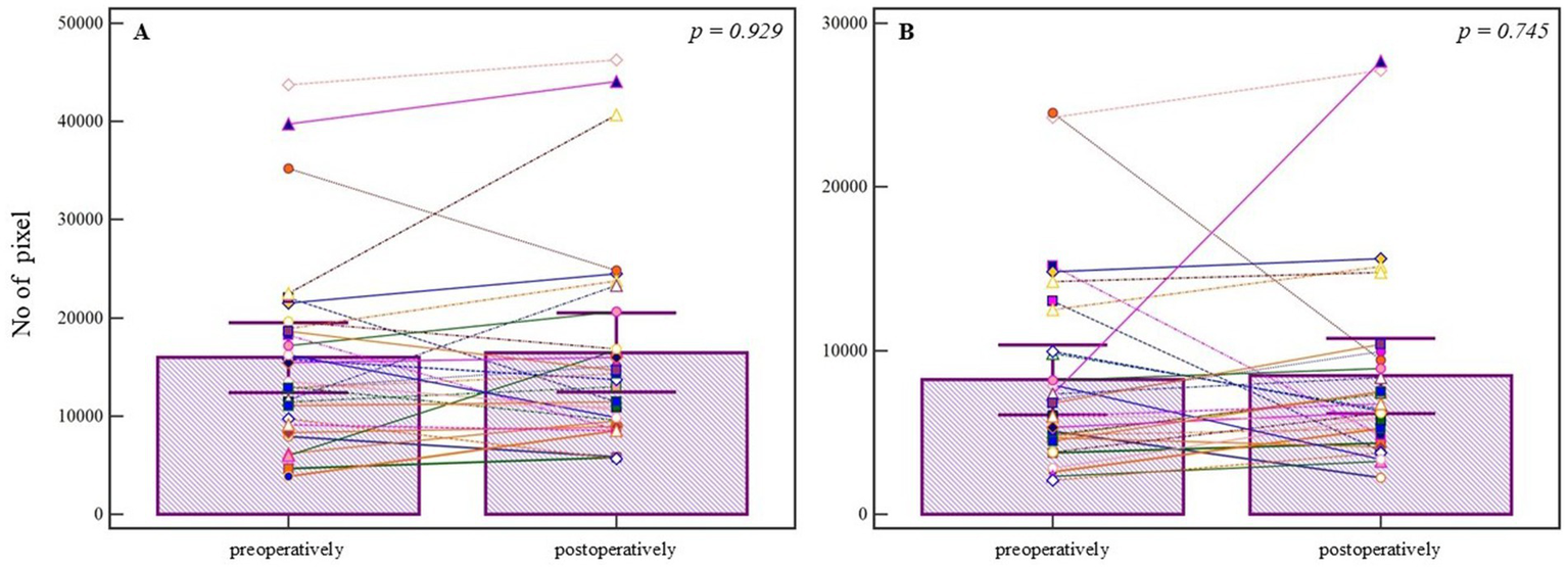 | Treatment group | Preoperative segmented pixels (Mean ± SD) | Postoperative segmented pixels (Mean ± SD) | p-value (segmented) | Preoperative refined pixels (Mean ± SD) | Postoperative refined pixels (Mean ± SD) | p-value (refined) |