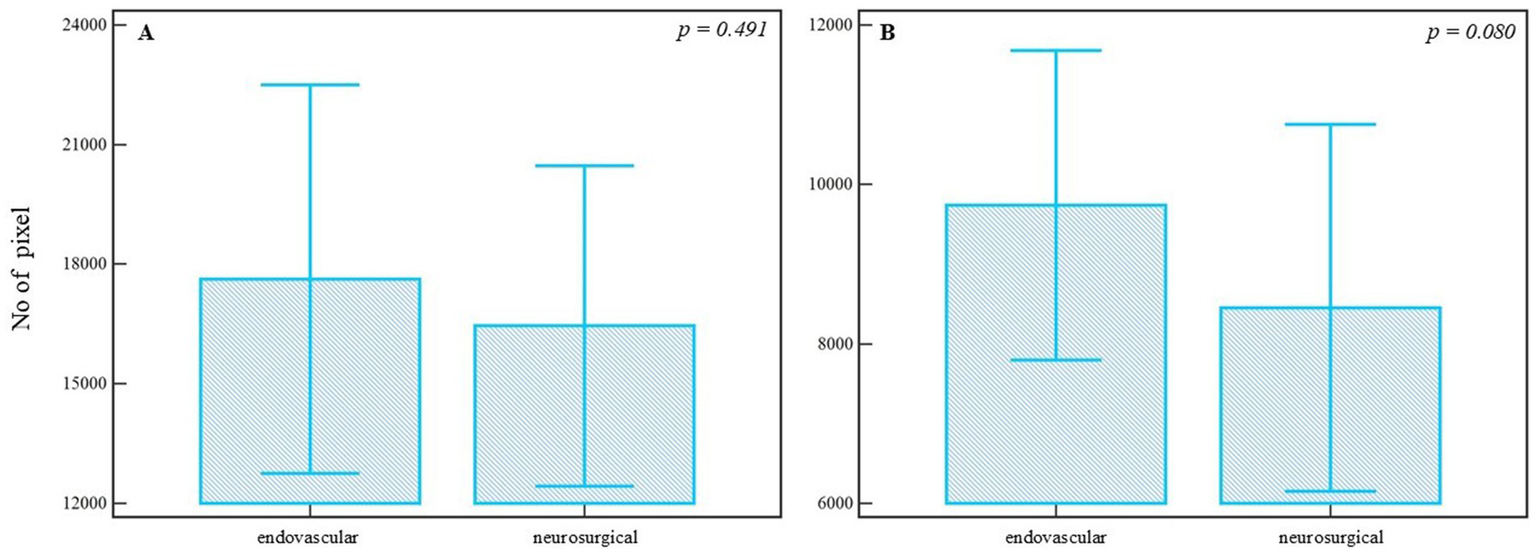 Comparison of postoperative angiographic images between endovascular and neurosurgical treatment groups. (A) Segmented pixel counts are higher in the endovascular group, but without statistical significance (p = 0.491, Mann-Whitney U test). (B) Refined pixel counts also show no significant difference between the groups (p = 0.080, Mann-Whitney U test). Bars represent group means; whiskers denote ±1 standard deviation. This plot is not a traditional boxplot but illustrates mean-centered group differences and variability. p-values are annotated above the comparisons.