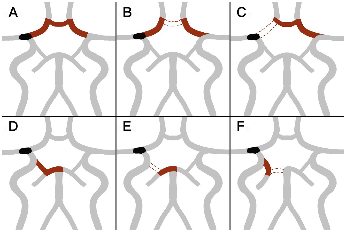 (A–C) Shows the configuration of the anterior circle of Willis (CoW). (A) Complete anterior CoW with opened bilateral initial segment of anterior cerebral artery (A1) and anterior communicating artery (ACoA). (B,C) Incomplete anterior CoW with closure of ACoA (B) or either side A1 (C). (D–F) Shows the configuration of posterior CoW. (D) Complete posterior CoW, with opened ipsilateral initial segment of posterior cerebral artery (P1) and posterior communicating artery (PCoA). (E,F) Incomplete posterior CoW, with closed ipsilateral PCoA (E) or ipsilateral P1 (F).