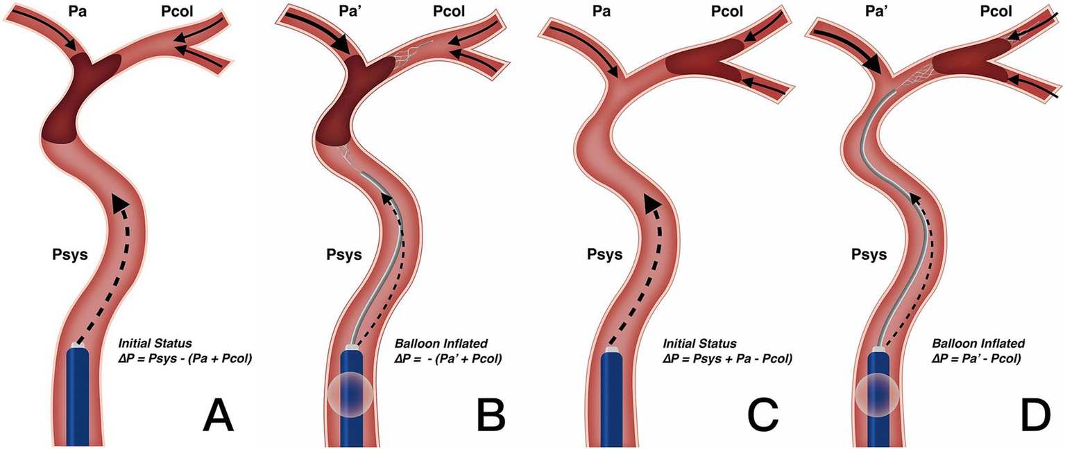 The pressure gradient generated by balloon inflation combined with aspiration is the fundamental principle underlying the BGC use. However, this pressure gradient is influenced by the configuration of the circle of Willis (CoW). As the primary collateral pathway, the CoW plays a key role in compensating for cerebral blood supply (22, 23). It is hypothesized that cross-flow through the anterior communicating artery (ACoA) or posterior communicating artery (PCoA) serves as a driving force for thrombectomy in cases of internal carotid artery (ICA) occlusion, but not in middle cerebral artery (MCA) occlusion. Consequently, the optimal hemodynamic conditions for maximizing BGC performance have yet to be determined.