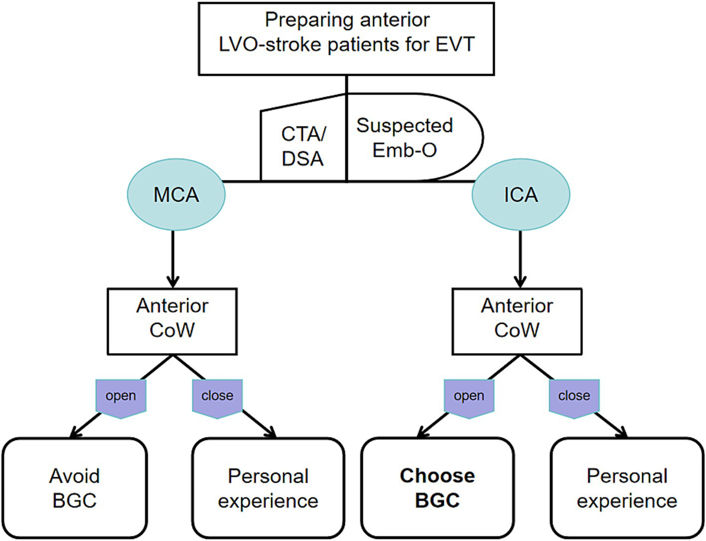 A complete anterior CoW was an independent factor associated with fewer thrombectomy passes and a shorter procedure time. For patients with ICA occlusion and a complete anterior CoW, the use of BGC was the optimal approach to improve overall thrombectomy efficacy.