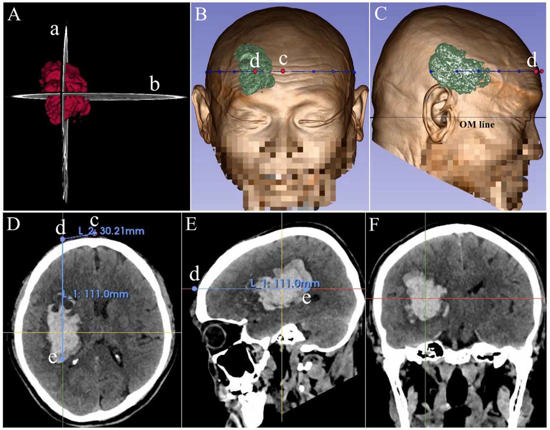 Figure 1. Diagram of surgical pathway planning. Panel (A): 3D hematoma model; Panels (B–C): 3D head reconstructions; Panels (D–F): axial, sagittal, and coronal CT views. The puncture trajectory (intersection of maximal axial and sagittal planes) extends along the hematoma’s long axis. Key points: c (sagittal line–puncture plane intersection), d (scalp puncture site), e (posterior edge of maximal axial plane). Distance measurements: de (depth from puncture point to catheter tip), cd (distance from sagittal line to puncture point).
