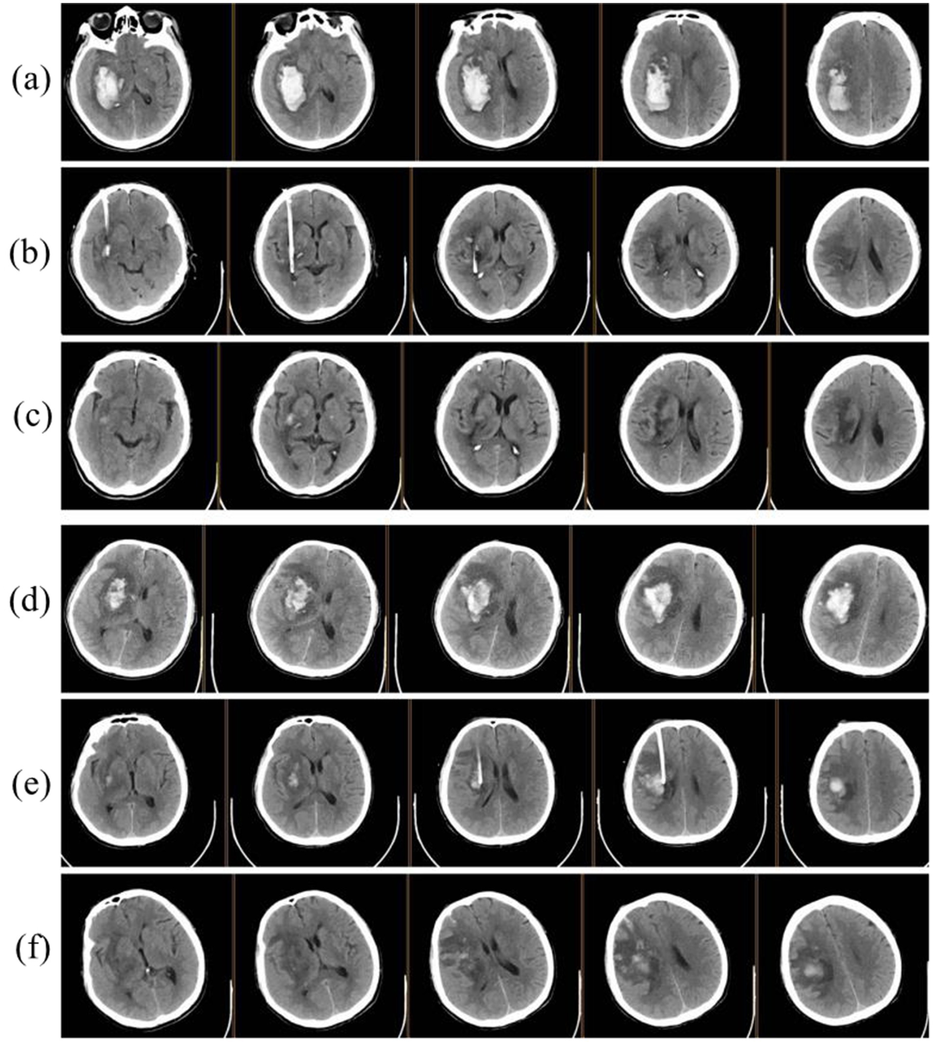 Figure 2. Illustration of minimally invasive surgery. (a) Preoperative CT showing right basal ganglia hemorrhage. (b,c) postoperative CT images at 24 h and 3 days. (d), preoperative CT of another patient demonstrating right basal ganglia hemorrhage with significant cerebral edema. (e,f) postoperative CT images at 24 h and 3 days.