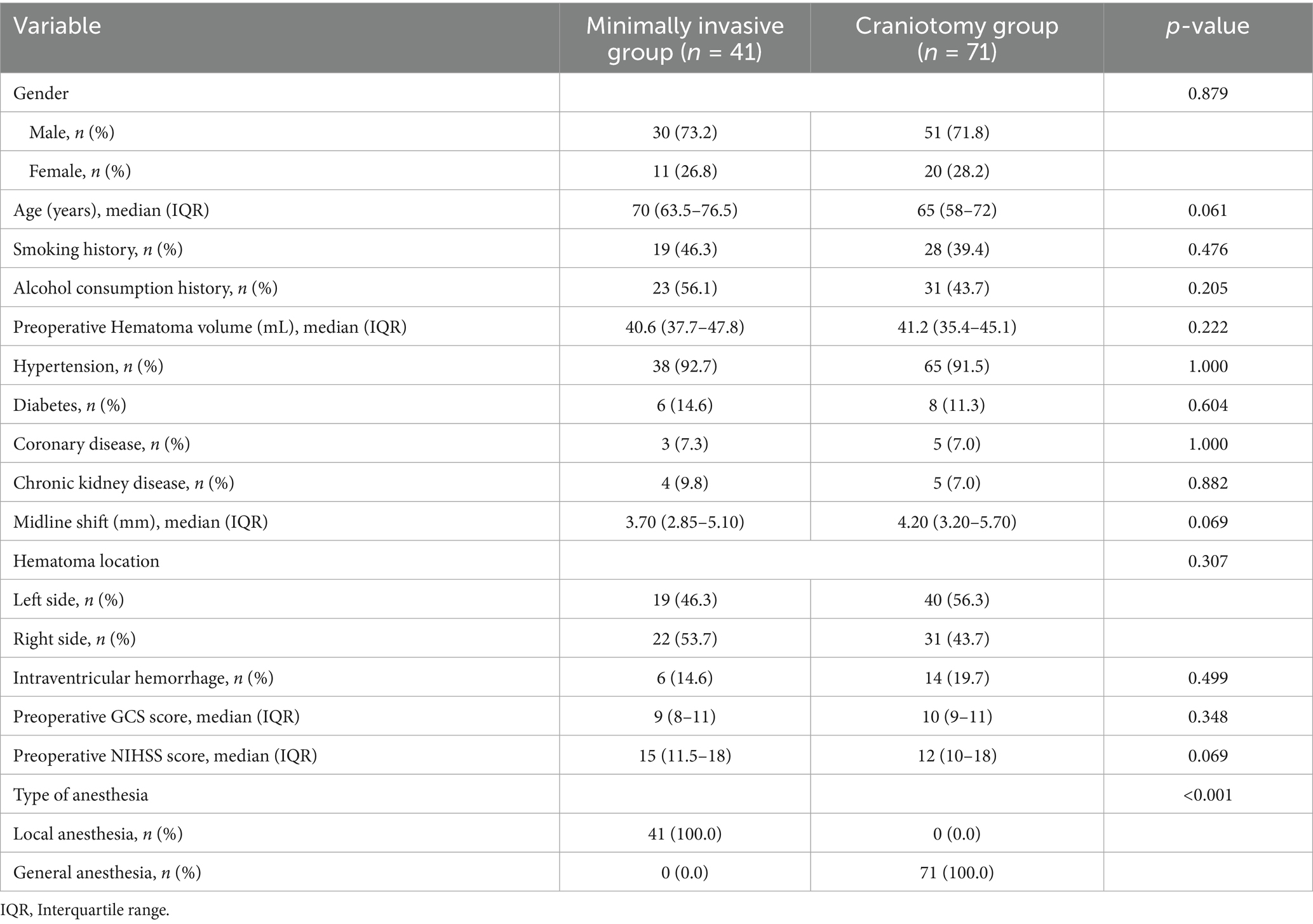 A total of 112 patients were enrolled in this study, with 41 assigned to the minimally invasive group and 71 to the craniotomy group. No significant differences were observed in baseline characteristics between the two groups (all p > 0.05). The minimally invasive group consisted of 30 males (73.2%) and 11 females (26.8%), with a median age of 70 years (IQR 63.5–76.5), while the craniotomy group included 51 males (71.8%) and 20 females (28.2%), with a median age of 65 years (IQR 58–72). Key hematoma and neurological variables were also comparable between the two groups: preoperative hematoma volume [40.6 (37.7–47.8) mL vs. 41.2 (35.4–45.1) mL], preoperative GCS score [9 (8–11) vs. 10 (9–11)], preoperative NIHSS score [15 (11.5–18) vs. 12 (10–18)], midline shift [3.70 (2.85–5.10) mm vs. 4.20 (3.20–5.70) mm], and the proportion of patients with intraventricular hemorrhage [6 (14.6%) vs. 14 (19.7%)]. Additionally, no statistically significant differences were found in terms of hematoma location or underlying diseases. Regarding the treatment approach, a difference was noted in anesthesia method: the craniotomy group exclusively received general anesthesia, whereas the minimally invasive group underwent local anesthesia. Detailed data are presented in Table 1.