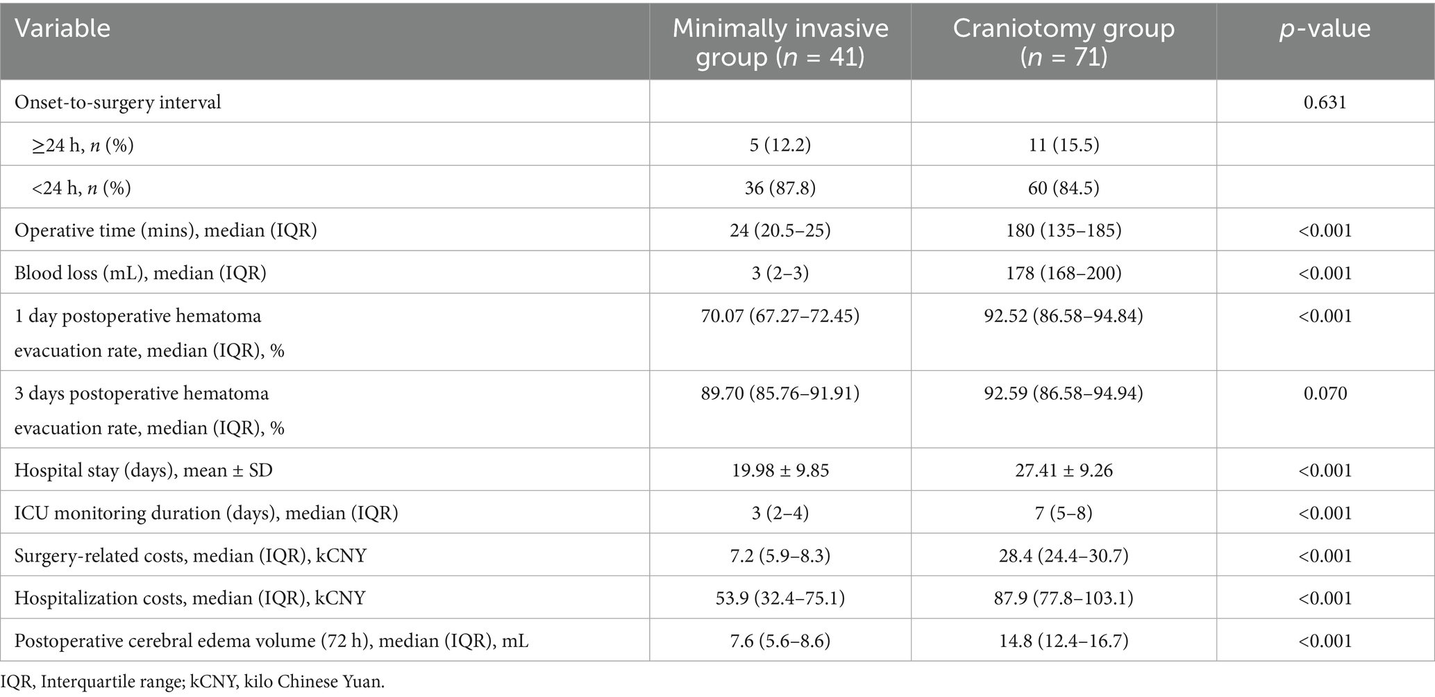 The cost data in this study were directly extracted from the hospital information system. Results showed that the total medical costs were significantly lower in the minimally invasive group than in the craniotomy group. This difference primarily stemmed from two factors: shorter intensive care unit stays and lower surgical expenses in the minimally invasive group. While pivotal clinical trials such as MISTIE III and ENRICH have established the clinical value of minimally invasive techniques, they did not provide economic comparisons. Our cost findings thus address this evidence gap. The cost advantages align with Yang et al.’s (30) and Xu et al.’s (31) conclusions in similar populations, collectively supporting the cost-effectiveness of minimally invasive techniques.