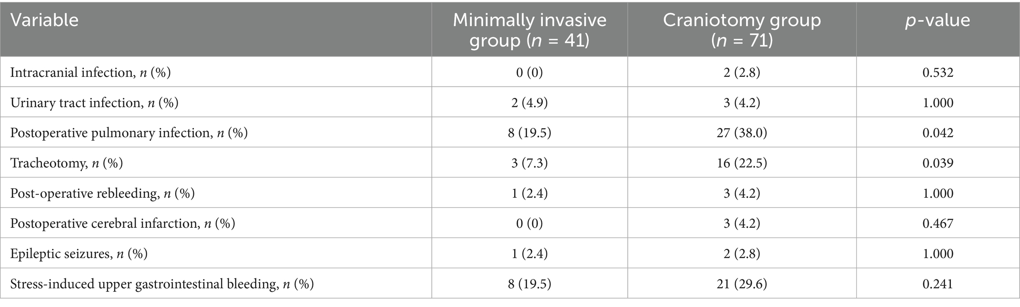 The minimally invasive group had significantly lower rates of tracheostomy (7.3% vs. 22.5%) and pulmonary infection (19.5% vs. 38.0%) compared to the craniotomy group (both p < 0.05). Regarding postoperative intracranial rebleeding, one case (2.4%) occurred in the minimally invasive group, while three cases (4.2%) occurred in the craniotomy group, with no statistically significant difference. All rebleeding cases involved minor hemorrhages that resolved spontaneously without additional surgical intervention. The craniotomy group showed slightly higher rates of cerebral infarction (4.2% vs. 0%) and intracranial infection (2.8% vs. 0%), though these differences were not statistically significant. Furthermore, the two groups had similar incidences of gastrointestinal bleeding, seizures, and urinary tract infections (Table 3).