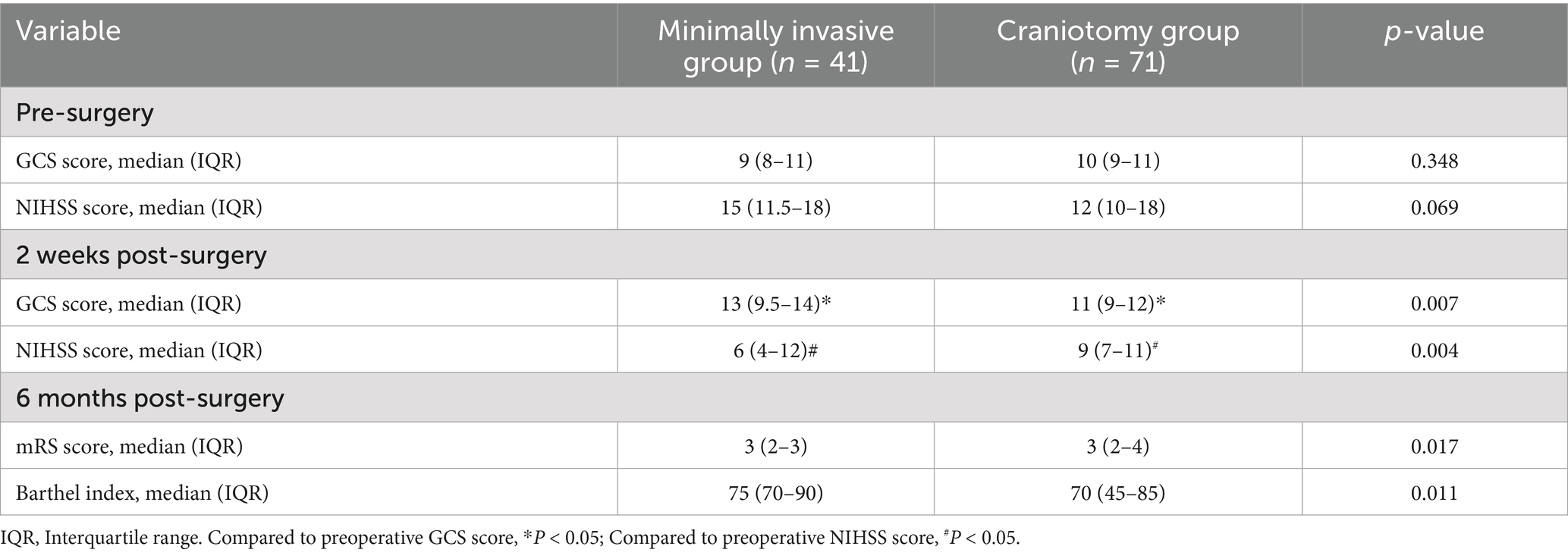 At 2 weeks postoperatively, both groups showed significant improvements in GCS and NIHSS scores compared to preoperative assessments (p < 0.05). The minimally invasive group achieved significantly higher GCS scores [13 (9.5–14) points vs. 11 (9–12) points] and notably lower NIHSS scores [6 (4–12) points vs. 9 (7–11) points] than the craniotomy group (p < 0.05). At the 6–month follow–up, the minimally invasive group exhibited significantly lower mRS scores [3 (2–3) points vs. 3 (2–4) points] and significantly higher Barthel Index values [75 (70–90) points vs. 70 (45–85) points] (p < 0.05) (Table 4).