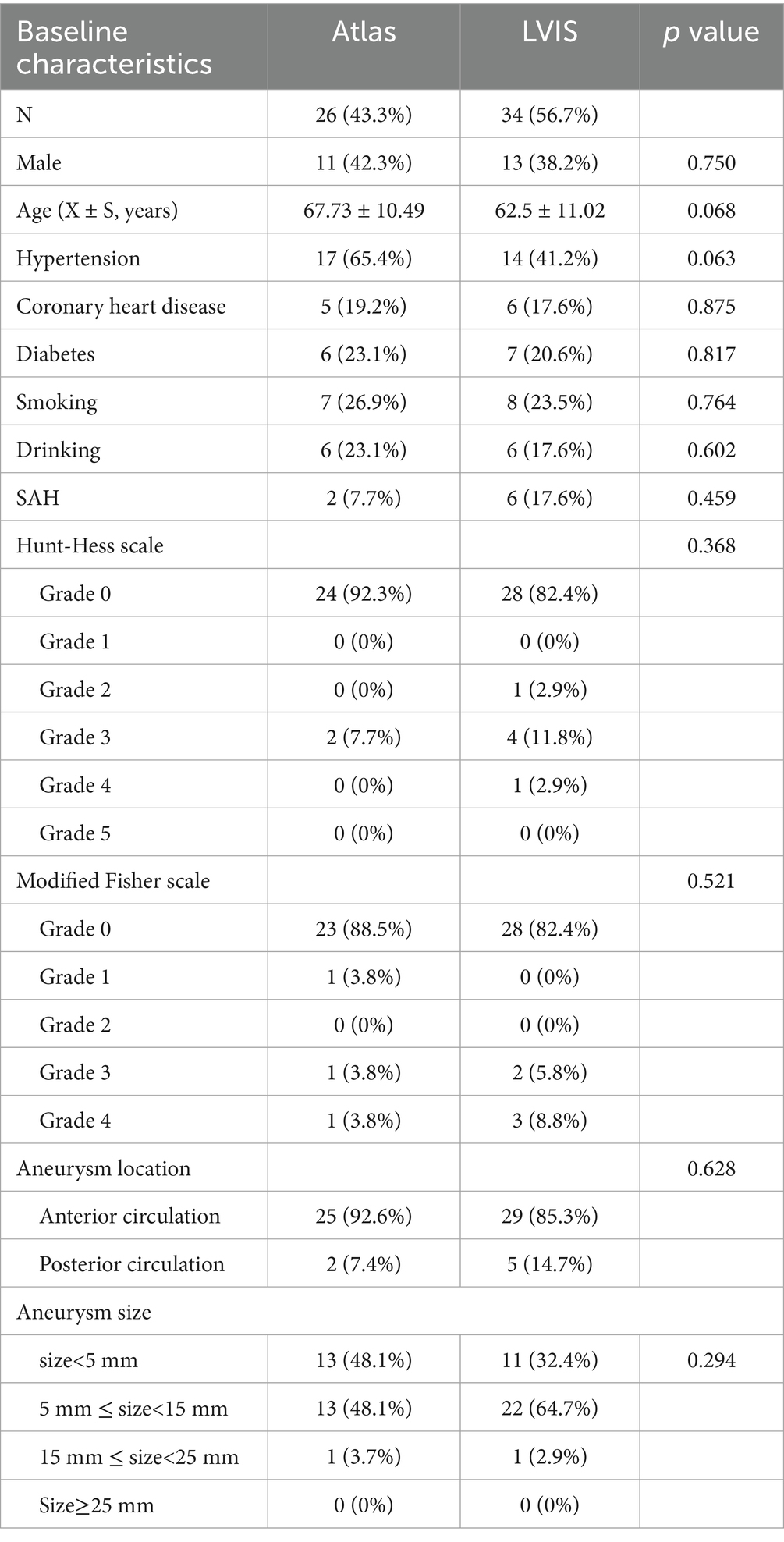 Methods: We retrospectively analyzed 60 patients who underwent coil embolization of WNIAs with the aid of Neuroform Atlas stent or LVIS stent from July 2017 to January 2024. They were divided into Neuroform Atlas group (n = 26) and LVIS group (n = 34). The patients’ baseline data, immediate effects, perioperative complications, and follow-up data were collected and compared.