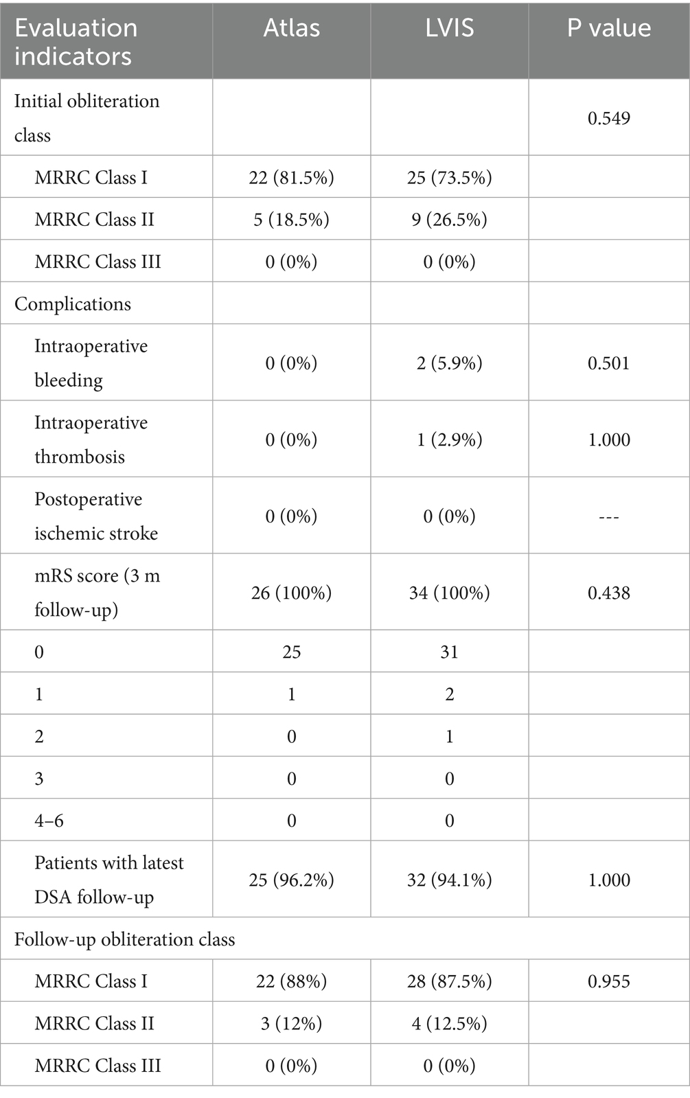 In the Neuroform Atlas group, a total of 29 stents were used in 26 patients with 27 aneurysms, with no cases of intraoperative cerebral hemorrhage, acute in-stent thrombosis, or postoperative ischemic stroke. In the LVIS group, a total of 34 stents (18 LVIS stents and 16 LVIS Jr. stents) were used in 34 patients with 34 aneurysms. In this group, intraoperative aneurysm rupture occurred in 2 patients (5.9%, 2/34), one of which (2.9%, 1/34) was complicated by acute in-stent thrombosis. No postoperative ischemic strokes occurred. There were no significant differences in the incidence of intraoperative bleeding (p = 0.501), intraoperative thrombosis (p = 1.000) and postoperative ischemic stroke between the two groups.