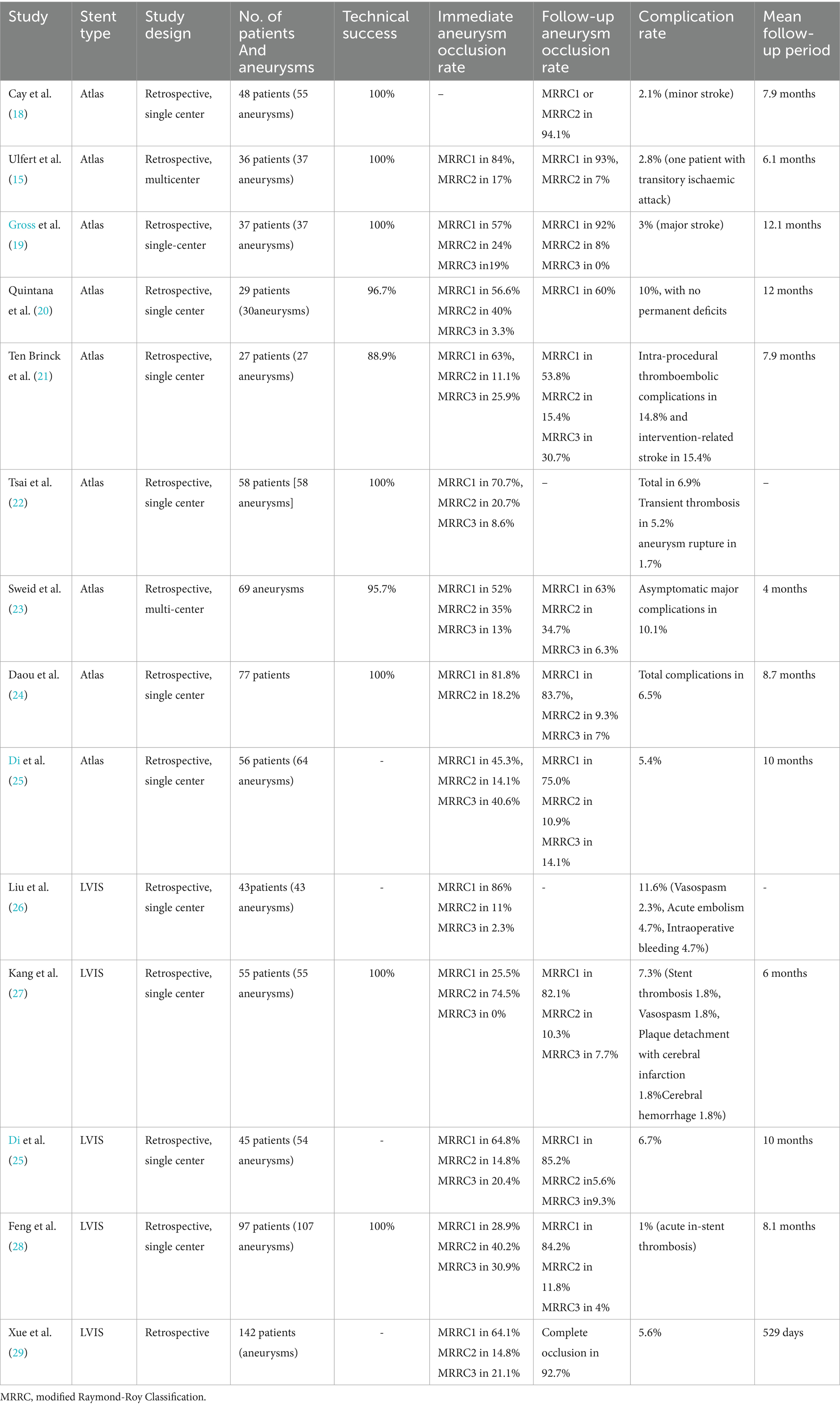 At present, there are many reports about atlas stent and LVIS stent in assisting coil embolization in wide necked intracranial aneurysms (15, 18–29), and most cases have good embolization effect and favorable outcomes, however, the results reported in different literatures are different (Table 4). According to previous literature studies, the complete immediate aneurysm occlusion rate of the Atlas stent in assisting coil embolization is between 45.3–84%, the complete follow-up aneurysm occlusion rate is between 53.8–94.1%, and the complication rate is between 2.1–15.4% (18–25). The complete immediate aneurysm occlusion rate of the LVIS stent is between 25.5–86%, the complete follow-up aneurysm occlusion rate is between 82.1–92.7%, and the complication rate is between 1 and 11.6% (25–29). The immediate aneurysm occlusion rates of the two stents were quite different. The complete follow-up aneurysm occlusion rates of both were high, the complication rates were relatively low, and the differences in efficacy between the two were not obvious. Both showed good safety and effectiveness (15, 18–29).