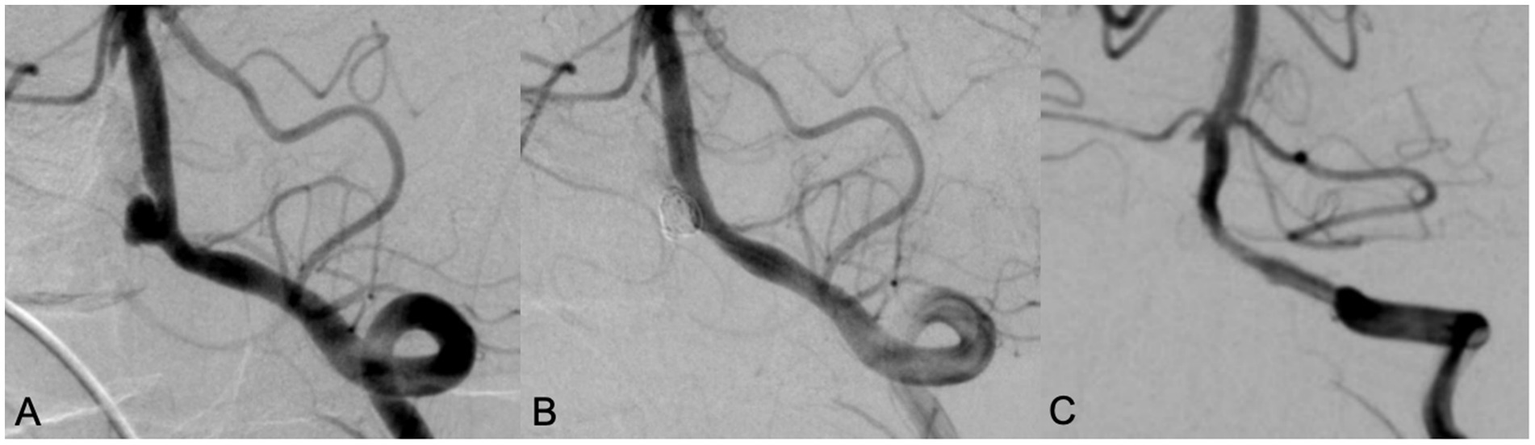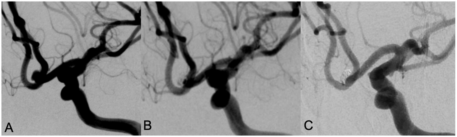 Patients were followed up regularly via phone or outpatient visit every 3 months after discharge. The modified Rankin Scale (mRS) score was assessed 3 months after operation, with a score of 0–2 indicating a favorable outcome and 3–6 indicating a poor outcome. CT, CTA, DSA were performed regularly during follow-up. The first follow-up cerebral DSA was performed 6 months to 1 year after operation, and if the aneurysm was not occluded completely, repeat cerebral angiography was performed annually.