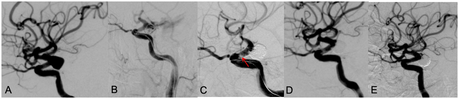 A 65 year old male patient with diplopia for 3 weeks. DSA showed a left posterior communicating aneurysm with wide neck (A). During the LVIS stent assisting embolization, the aneurysm ruptured with contrast leakage (B). After rapid dense coil packing, contrast leakage was stopped, however, an in-stent thrombosis (red arrow) was observed (C). After intravenous use of tirofiban, thrombosis disappeared, the aneurysm was occluded with MRRC grade 1 (D). A 9 months’ follow-up DSA examination showed the aneurysm was occluded well with MRRC grade 1 (E).