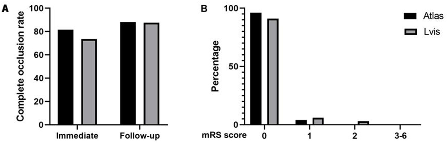 Comparison of complete occlusion rate between two groups of aneurysms immediately after surgery and during follow-up (A). Comparison of mRS scores between two groups of patients at 3-month follow-up after surgery (B).