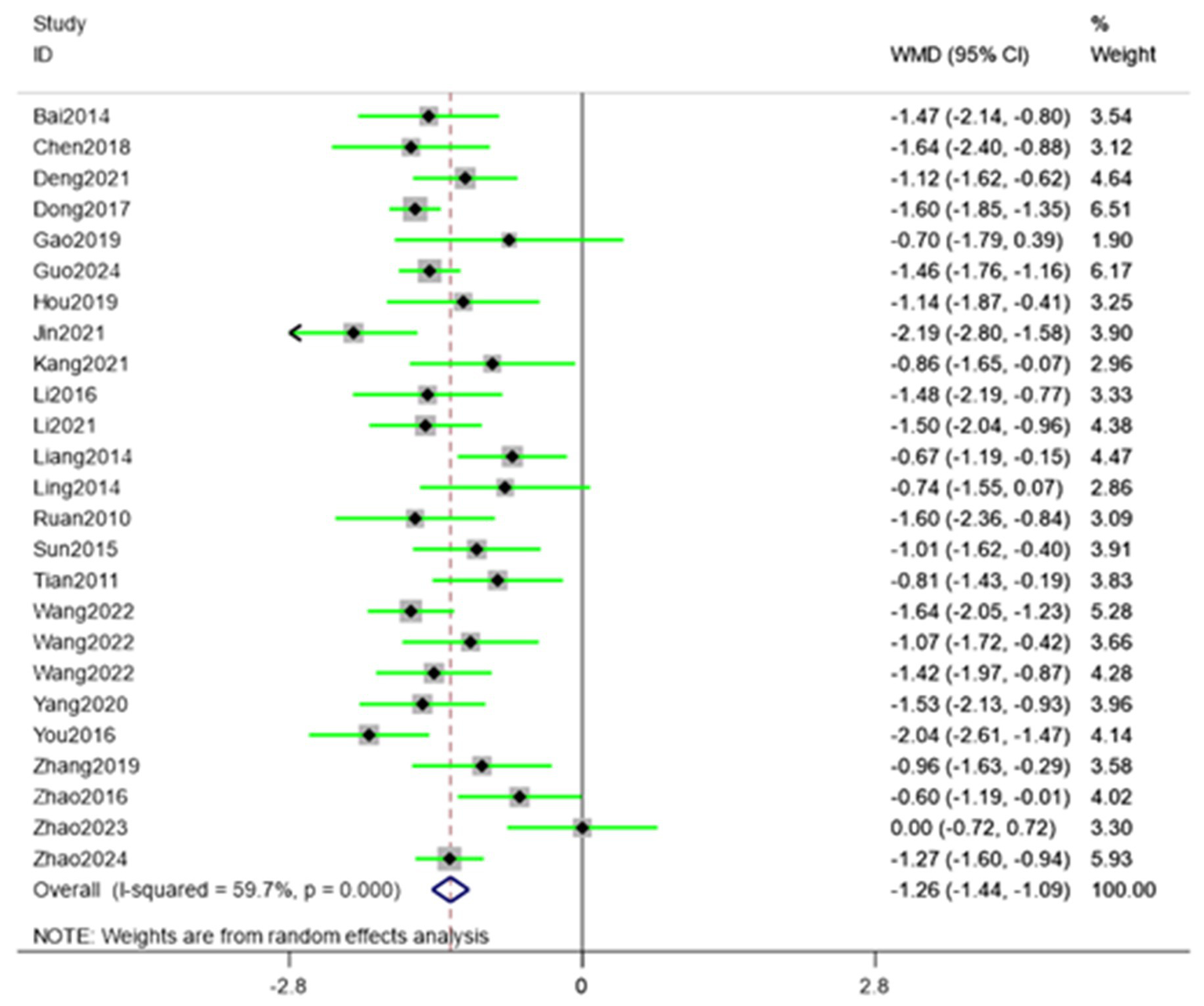| Guo (2024) (35) | 47/47 T: Mean age (31 ± 8) y, Mean duration (8.22 ± 3.21) y; C: Mean age (32 ± 8) y, Mean duration (8.48 ± 3.35) y | Acupuncture (30 min, qd, Five times a week) + Conventional therapy (Intravenous infusion of Infliximab [Each dose is 5 mg/kg, Take medication once in weeks 2and 6, once every 6 weeks]) 32w | Conventional therapy (Intravenous infusion of Infliximab [Each dose is 5 mg/kg, Take medication once in weeks 2and 6,once every 6 weeks]) 32w | UB62, KID6 | VAS, ESR, CRP, BASDAI, BASFI, Clinical efficacy |