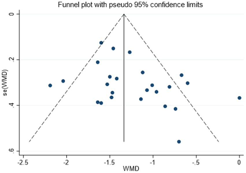 The meta-analysis was performed in Stata 15.0 software. Due to the uncertainties in acupuncture research (for example, in terms of research design, there are multiple and inconsistent internal parameters), the study internally employed a random-effects model. For continuous data, when the evaluation scale and units are unified (such as VAS, BASDAI, and BASFI), MD is used as the effect value, otherwise SMD is used as the effect value (such as IL-1, 1L-6, TNF-α). The effect value for dichotomous variables was the relative risk (RR). Heterogeneity was assessed using the I2 statistic. To evaluate the robustness of findings, sensitivity analyses were conducted by sequentially excluding individual studies. Publication bias was assessed for primary outcomes through visual inspection of funnel plots, supplemented by Begg’s and Egger’s tests. If statistical significance was indicated (p < 0.05), a trim-and-fill analysis was performed to evaluate the impact of potential bias. For outcomes with substantial heterogeneity (I2 > 50% and ≥10 studies), subgroup analyses were performed by intervention modality, treatment duration, and control type to explore potential sources.
