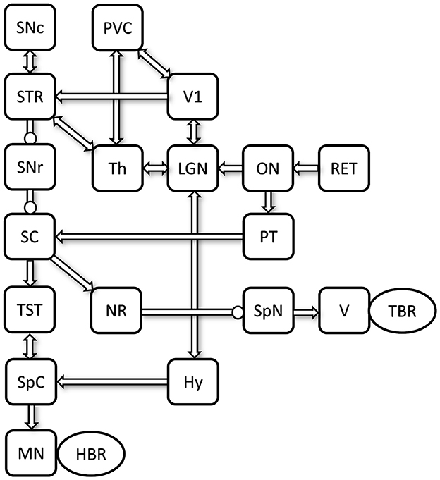 The optic nerve (ON), which transmits visual input from the retina (RET) to the brain, is commonly affected in optic neuritis (72). ON sends feedforward projections to both the pretectum (PT) (73) and the LGN. PT, which is involved in processing visual input and regulating the pupillary light reflex, projects to the SC, a critical center for visual integration (74). The LGN processes visual information received from the ON and relays it bidirectionally to the primary visual cortex (V1), playing a crucial role in visual perception (74). V1 connects bidirectionally with PVC and the striatum (STR). Additionally, the LGN connects bidirectionally to the hypothalamus (Hy), which influences SpC activity, forming another key relay in visual and dopaminergic signaling. Both the LGN and PVC also communicate with the thalamus (Th), further integrating sensory and dopaminergic inputs (75). The STR, a core input hub of the basal ganglia, receives feedforward input from V1 and connects bidirectionally with Th (58, 74). It is closely linked to the SNc, a primary dopamine-producing nucleus that modulates basal ganglia activity (76). The STR also sends inhibitory projections to the substantia nigra pars reticulata (SNr), which in turn inhibits SC activity (77).