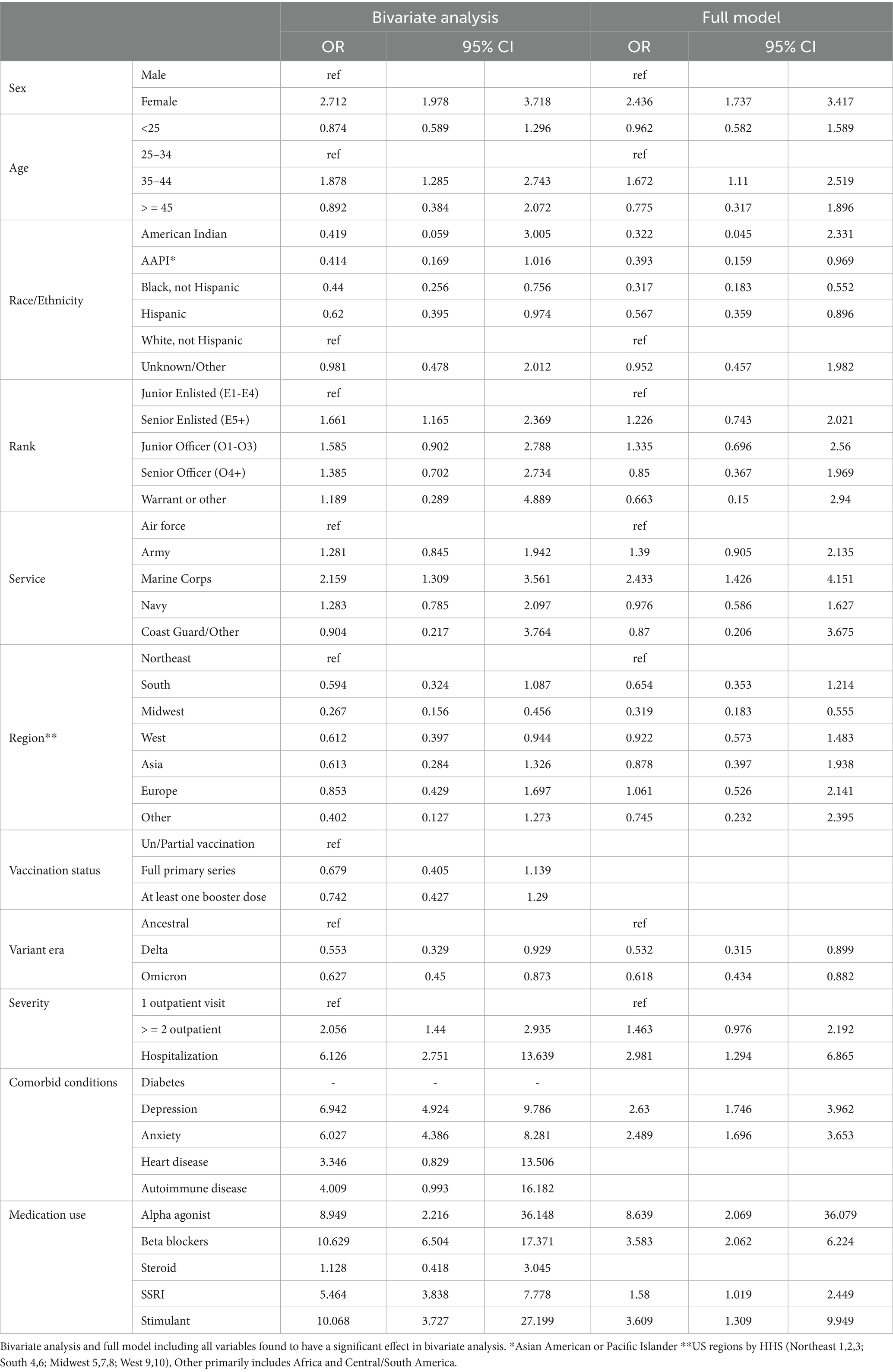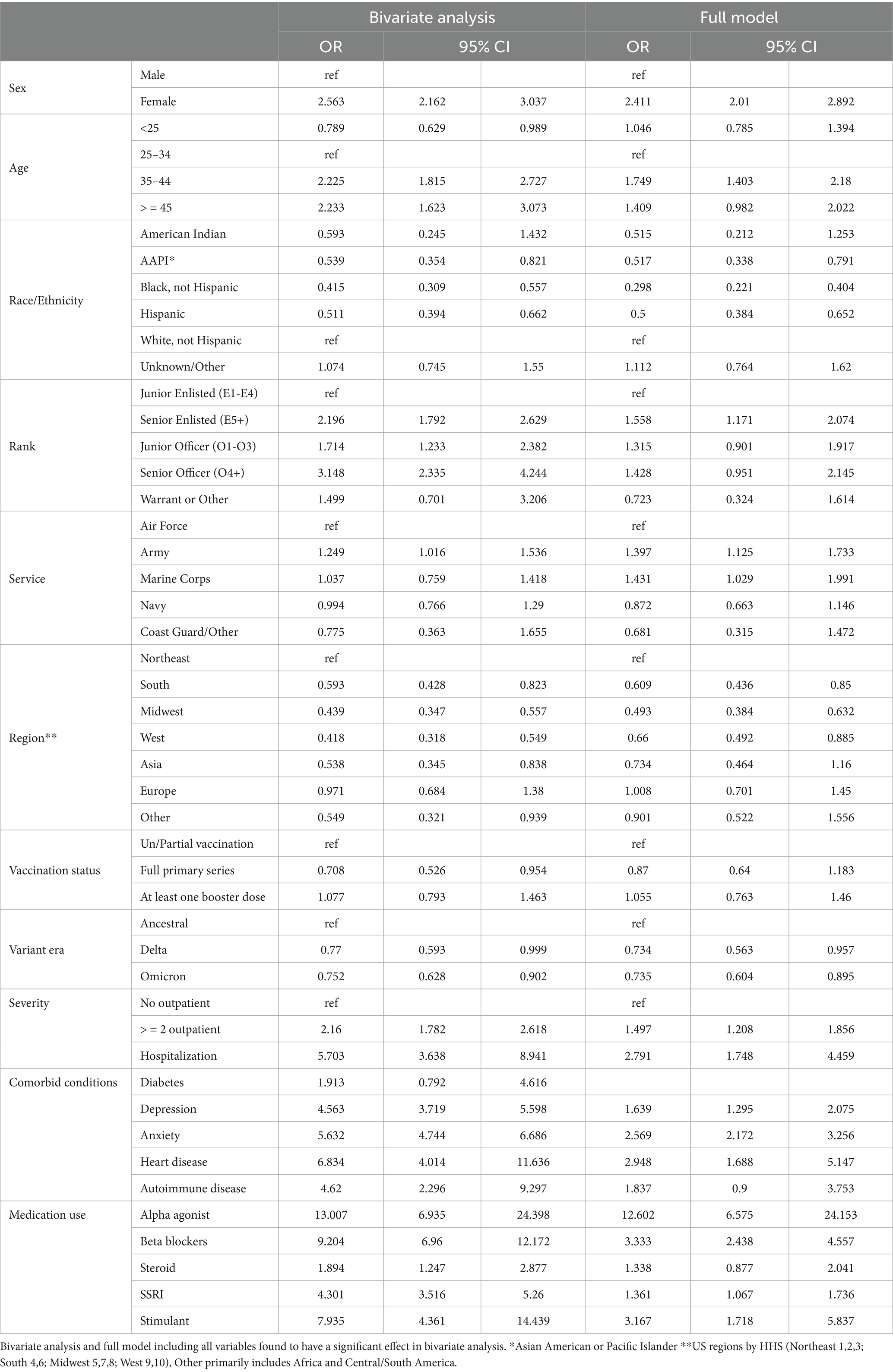 The bivariate analyses evaluating factors among those with COVID-19 infection associated with probable PASC dysautonomia are presented (Table 4). The majority of variables evaluated were found to have significant associations with PASC dysautonomia with the exception of comorbid heart disease, diabetes, autoimmune-related disease, prescription of corticosteroids before COVID infection, and vaccination status. Strikingly, the severity of COVID-19 infection showed a strong association with risk of dysautonomia that increased with the level of severity; additionally in relation to variant era of infection, with earlier variant eras of COVID-19 (prior to Delta variant) more associated with PASC dysautonomia. Further findings related to demographic status including higher risk among those who were white, non-Hispanic, women, aged 35–44, or residing in the Northeast. Prevalence of PASC dysautonomia among Marines also appears to be higher than other Services, and no significant effect associated with rank appears to be present. The prescription of beta blockers, alpha agonists, selective serotonin reuptake inhibitors, or stimulants within 90 days before COVID-19 infection also appears to have a strong positive association with PASC dysautonomia, along with the comorbid conditions of depression and anxiety. The results of the sensitivity analyses conducted following the same approach using the definition of possible PASC dysautonomia are presented (Table 5). Differences noted in the bivariate analyses include additional increased association with PASC dysautonomia in the >45 age group, in Service members in the Army, in ranks above junior enlisted, and among those with a history of heart disease or autoimmune disease and prescribed stimulants or steroids prior to COVID infection. Additionally, receiving the full primary series of COVID-19 vaccination has a protective effect in this group, however those with a booster dose did not have increased protection. In the full model many of these significant findings were attenuated to the point of being non-statistically significant, including the increased odds of PASC dysautonomia in the >45 age group, and ranks other than senior enlisted, comorbid autoimmune disease, concomitant use of steroids, as well as the protective effect of vaccination noted in the bivariate analysis. The results of the sensitivity analysis using the Firth’s penalized likelihood approach are provided in the Supplementary Table S3, with no deviations of note from our primary analysis.