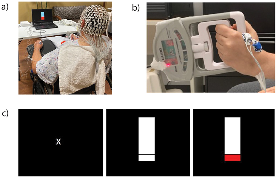 Figure 1. Participants wore an electroencephalography (EEG) net and electromyography (EMG) electrodes on bilateral upper-extremity muscles (a). Participants squeezed a grip device (b) when the laptop images changed from rest [(c), left] to a thermometer [(c), center] and raised the thermometer to a target that corresponded to 20% of their maximal voluntary isometric force [(c), right].