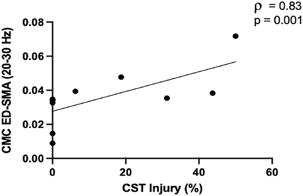 We identified several associations between CMC and CST injury across the cohort (n = 21) and in subgroups before FDR correction (Supplementary Table S1). Following FDR correction, high beta CMC between electrodes overlying SMA and affected extensor digitorum positively related to CST injury in the mild-moderate injury subgroup (ρ = 0.83, p = 0.001; Figure 2).