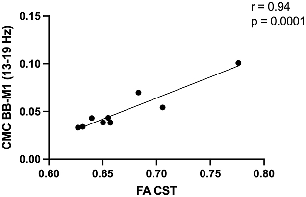 We did not observe associations between CMC and CST integrity across the cohort (n = 17; ρ range = 0.006–0.58, p range = 0.07–0.98). In the high-integrity group (n = 9), several CMC values were associated with CST integrity before FDR correction (Supplementary Table S2). Following FDR correction, low beta CMC between electrodes overlying ipsilesional M1 and affected biceps positively correlated with CST integrity (r = 0.94, p = 0.0001; Figure 3). We did not find any association between CMC values and CST integrity in the severe group (n = 8; ρ range = 0.009–0.57, p range = 0.06–0.97). To justify the reliability of these reported associations (i.e., our ability to detect these associations), we performed a post hoc power analysis using the observed correlation coefficients and current sample sizes. The achieved power was 0.94 (CST injury and high beta CMC between electrodes overlying SMA-extensor digitorum) and 0.99 (CST integrity and low beta CMC between electrodes overlying M1-biceps).