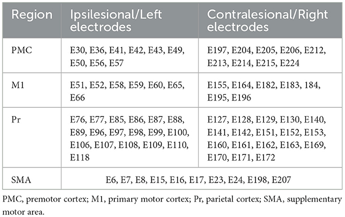 CMC measurements were computed between electrodes overlying the ipsilesional primary motor cortex (M1) and secondary motor areas including the premotor cortex, supplementary motor area (SMA), and parietal regions with each affected extremity upper-extremity muscle. We selected M1 based on work demonstrating reduced CMC between M1 and upper-extremity musculature following stroke (18, 19). We included secondary motor areas due to their role in motor control, visuomotor processing, and planning, organizing, and execution of goal-directed behavior (31, 32), important components of the task employed in this work. Table 1 lists the corresponding electrodes for each region of interest. We recorded EMG activity from electrodes overlying flexor digitorum and FDI (agonists) which are responsible for generating and stabilizing the grip force, and from extensor digitorum and biceps (antagonists), which prevent excessive finger flexion and maintain forearm and elbow position. We computed delta CMC since previous work identified that resting-state delta-band coherence with ipsilesional M1 correlated to greater injury and poor motor status in the sub-acute stroke stage (22). Additionally, other work reported reduced delta CMC between the cortex and thigh and leg muscles in individuals with chronic stroke compared to controls during a standing balance task that involved swaying the support surface (33). Additionally, we measured beta CMC given the prominence of beta oscillations during isometric muscle contraction (34), its involvement in motor control (21, 35), and evidence that demonstrated diminished beta CMC post-stroke (16, 19). We evaluated both low (13–19 Hz) and high (20–30 Hz) beta CMC, as recent studies have demonstrated distinct neural sources and roles in motor control between these frequency bands (36, 37). For each region of interest (ROI), CMC values were calculated as the average coherence across all EEG–EMG channel pairs overlying the ROI and the corresponding muscle. Coherence values range from 0 to 1 where 1 indicates consistent amplitude ratios and phase differences between signals across time in a given frequency band.