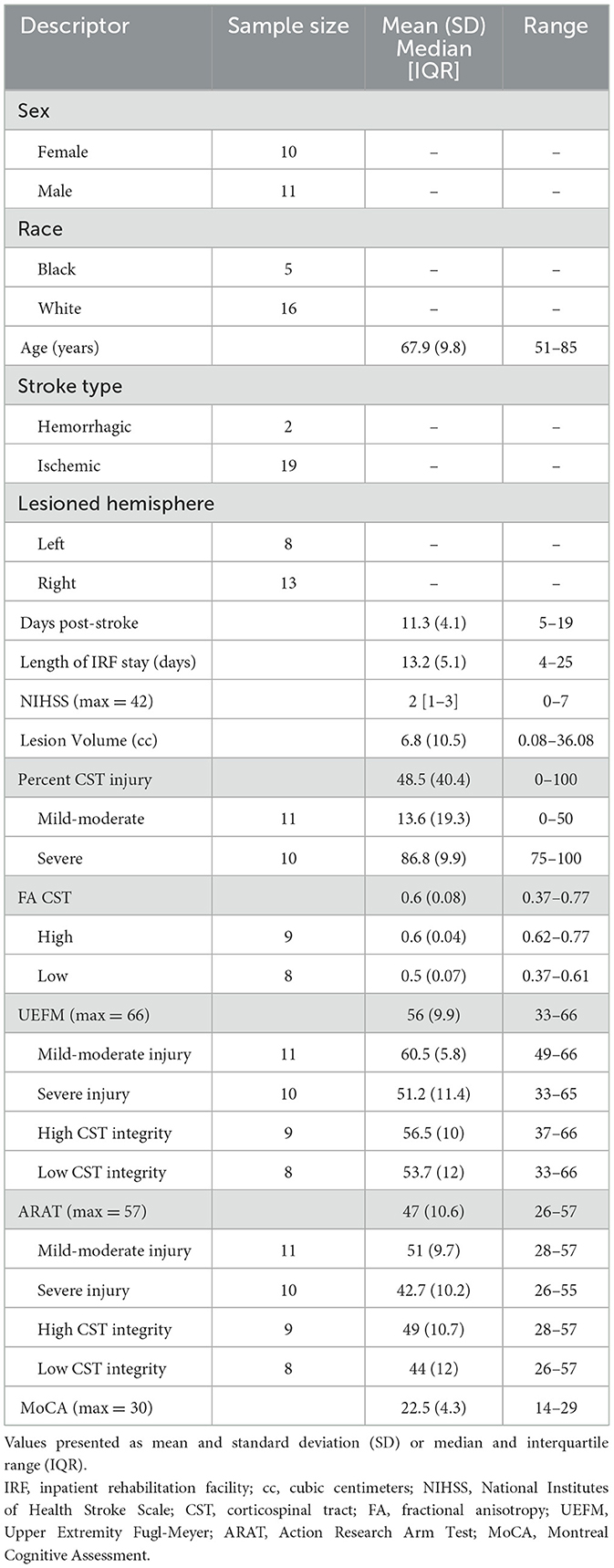 This work features a cohort published in a series of inpatient stroke studies (27, 41). Of the 30 individuals enrolled, 21 participants were able to complete the grip task with their affected extremity (10 females; mean age 67.9 ± 9.8; 11.3 ± 4.1 days post-stroke; Table 2). Nine participants had severe hemiparesis (UEFM range: 2–12 points out of 66), preventing task performance or adequate force generation for detection by the grip device. Twenty-one participants were included in analyses involving CMC and CST injury while 17 participants were included in analyses involving CMC and CST integrity.