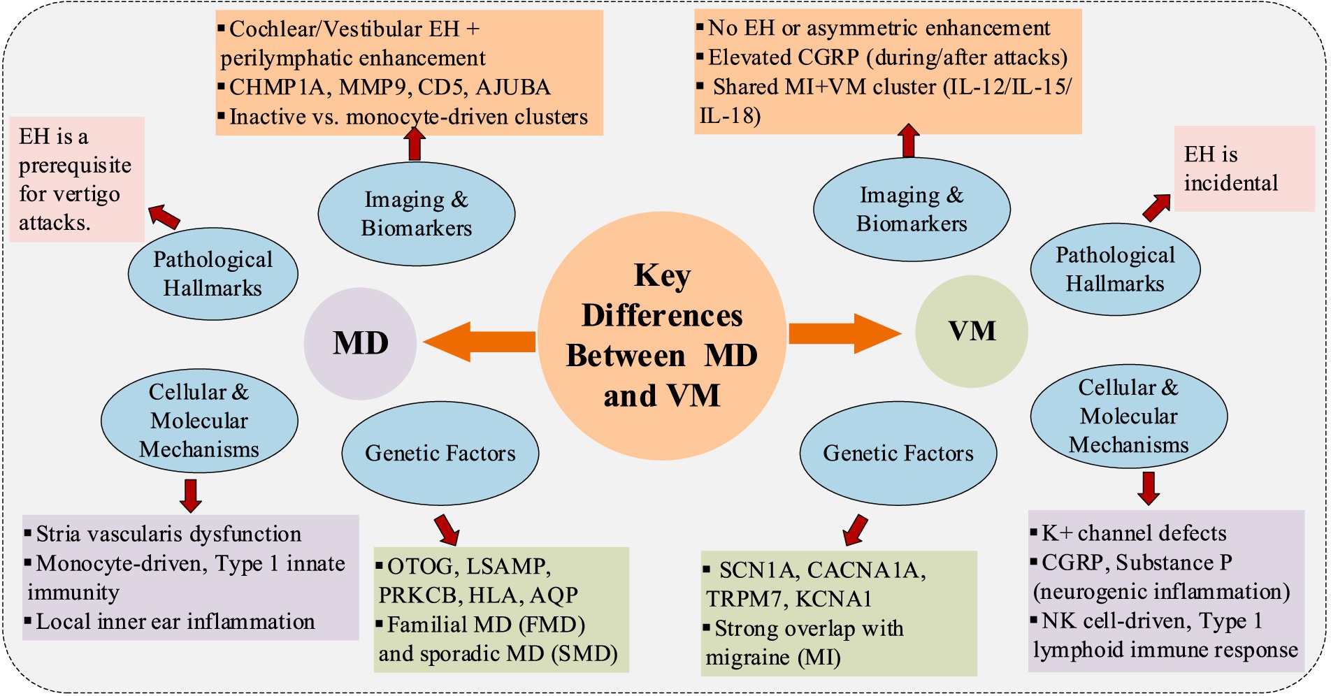 In summary, this section elucidates the differences between MD and VM at cellular, molecular, and genetic levels. As illustrated in Figure 1, the key distinctions can be summarized as follows: EH serves as the characteristic pathological hallmark of MD but lacks specificity in VM, where ion channel dysfunction and neurogenic inflammation predominate. Immune profiling via single-cell RNA sequencing reveals divergent pathways - MD exhibits monocyte-driven responses while VM demonstrates type 1 innate immune responses. At the genetic level, MD-associated genes differ significantly from VM-linked loci, supporting their distinct etiopathogenic mechanisms.
