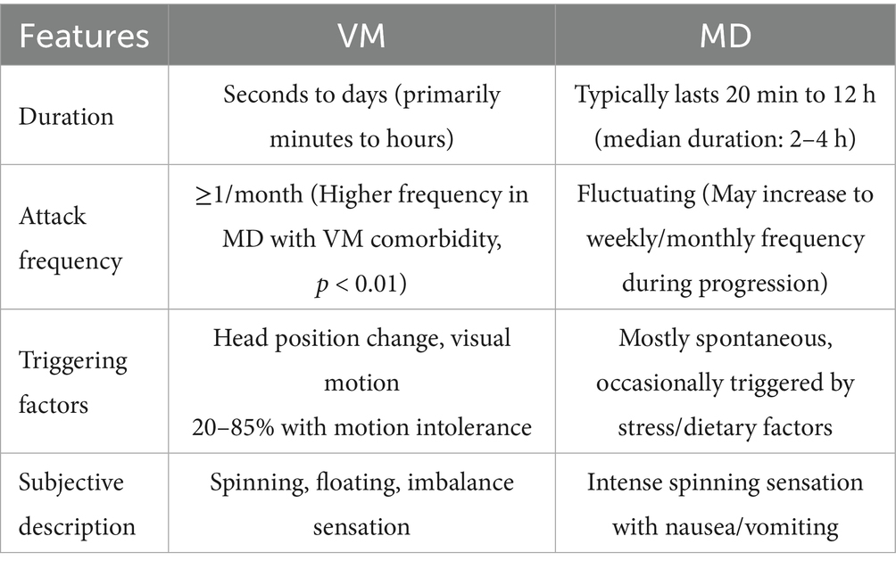 Current research widely recognizes that the duration, frequency, and characteristics of vertigo episodes are the primary factors for differential diagnosis between MD and VM. A comparison of these factors is presented in Table 1 (26, 31–36).