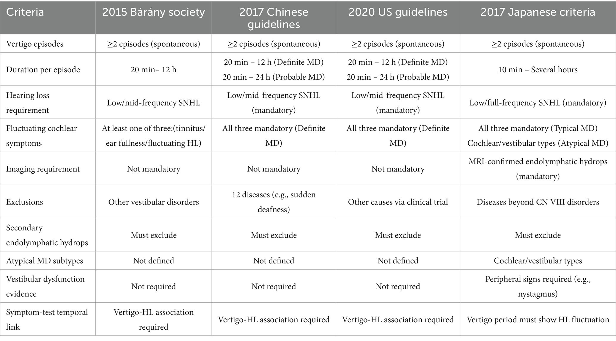The pathogenesis of MD and VM exhibits significant differences at the cellular and molecular genetic levels of the inner ear, with distinct clinical manifestations. To differentiate between MD and VM, scholars and organizations have developed specific diagnostic criteria based on their clinical presentations. These criteria continue to evolve, with MD standards varying across countries yet sharing similarities alongside notable differences (42–44). Diagnostic criteria for MD from different countries are summarized in Table 2.