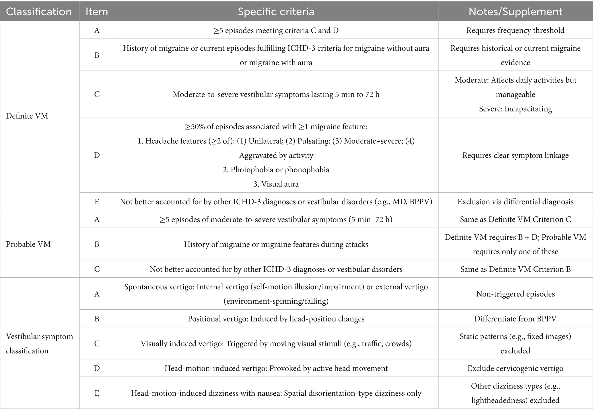 In contrast, VM diagnostic criteria achieved global consensus among researchers. However, VM’s journey from proposal to inclusion in ICHD-3 spanned multiple stages. The 2012 joint Barány Society and International Headache Society (IHS) criteria first defined VM as a distinct entity, requiring vestibular symptoms and migraine association (“definite VM”) or partial links (“probable VM”). ICHD-3 beta (2013) adopted Barány’s framework but added ≥5 episodes and exclusion of other vestibular disorders. Barány’s 2018 update expanded symptoms to include motion sensitivity and visually induced dizziness, allowing non-simultaneous vertigo and headache. Current international standards (ICHD-3, 2018; revised 2019) are detailed in Table 3 (42–44).