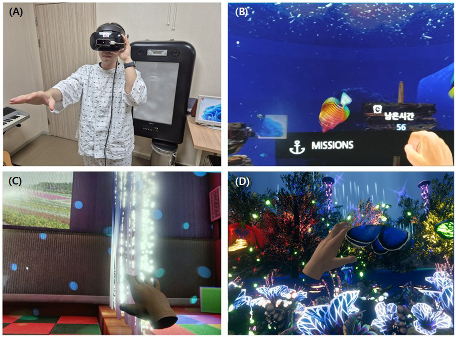 The VR program used in this study was independently developed through close collaboration between clinical rehabilitation physicians from the CHA Bundang Medical Center and technology developers from Side9 Inc. (Republic of Korea). Three types of VR rehabilitation training content were developed using the Unity3D game engine (Figure 1). Patients could voluntarily participate in adjunctive fully immersive VR rehabilitation training, which involved wearing a VR headset device (Oculus Rift, United States), a motion sensor (HTC Vive tracker, Taiwan), and a hand-tracking device (LeapMotion, United States). The VR intervention consisted of three components: (1) “Undersea Adventure,” which promoted voluntary movement and attention by encouraging patients to catch fish in an underwater virtual environment while enhancing short-term memory; (2) “VR Snoezelen,” which provided multi-sensory stimulation (visual and auditory) designed to promote relaxation, reduce stress, and stimulate cognitive activity; and (3) “Avatar,” aimed at enhancing voluntary motor control and selective attention by catching color-coded butterflies in a dynamic forest setting.