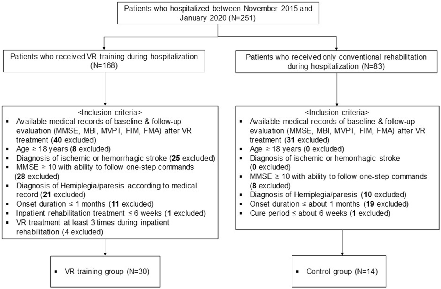 This study is a retrospective case-control study. We included patients with functional impairment who were hospitalized at the Department of Rehabilitation, CHA Bundang Medical Center, South Korea, between November 2015 and January 2020. Inclusion criteria were as follows: (1) Underwent baseline and discharge rehabilitation assessments, including the Mini-Mental State Examination (MMSE), modified Barthel Index (MBI), Motor-Free Visual Perception Test (MVPT), functional independence measure (FIM), and FMA during admission (2) Age >18 years, (3) Diagnosis of ischemic or hemorrhagic stroke, (4) MMSE ≥10 with the ability to follow one-step commands, (5) Presence of definite hemiplegia or hemiparesis, (6) Stroke onset duration <1 month (or 40 days), and (7) length of hospital stay <1 month (or 40 days). Among the patients who met the inclusion criteria, we compared individuals who received occupational therapy (OT), including VR-based upper limb training at least three times, to a control group that received only conventional OT. VR participation was based on voluntary enrollment. As this was a retrospective case-control study, informed consent was not obtained from all participants.