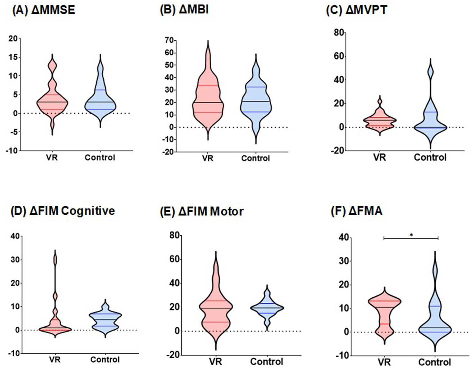For other functional outcomes, including ΔMMSE [VR: 3.00 (1.00; 5.00) vs. control: 3.00 (1.00;6.00); W = 183, p = 0.96], ΔMBI (VR: 24.03 ± 14.04 vs. control: 21.86 ± 12.10; t = 0.84, p = 0.62), ΔFIM cognition [VR: 1.00 (0.00; 4.00) vs. control 4.00 (2.00; 7.00); W = 150.5, p = 0.07], ΔFIM motor (VR: 18.34 ± 14.03 vs. control: 19.43 ± 6.12; t = 0.45, p = 0.73) and ΔMVPT [VR: 6.00 (2.00; 8.00) vs. control: 0.00 (0.00; 12.00); W = 275, p = 0.43], there were no statistically significant differences between the two groups.
