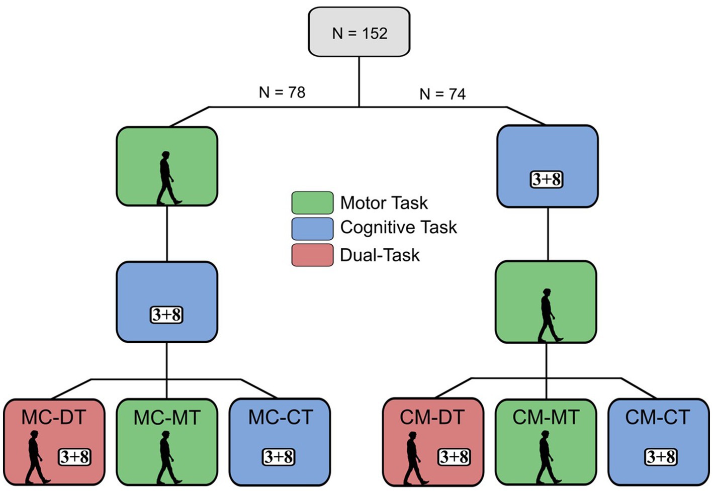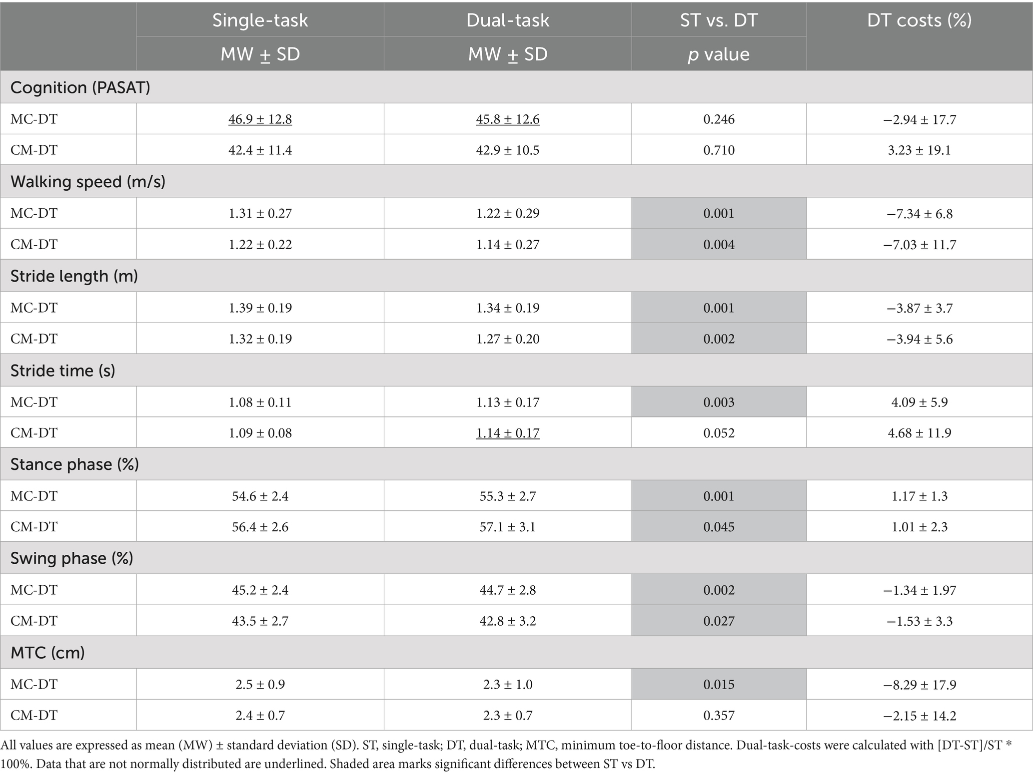 Statistical analysis was performed with SPSS 30 (Chicago, IL, United States). To test normality of distributions, Shapiro–Wilk tests were implemented for all gait parameters (i.e., walking speed, stride length, stride time, the duration of the stance, the duration of the swing phase and minimum toe-to-floor distance) as well as the cognitive performance (PASAT) during single- and dual-task. The homogeneity of variance was tested using Levene’s test. To evaluate the effect of task sequencing (between-subject design), we calculated the “task-costs” (e.g., performance decrement from baseline) for both dual-task (i.e., dual-task-costs = [dual-task – single-task] / single-task * 100%) and single-task (i.e., single-task-costs = [single-task2 – single-task1] / single-task1 * 100%) conditions and performed an independent t-test (i.e., comparing dual-task costs between group MC-DT and group CM-DT, single-(motor)-task costs between group MC-MT and group CM-MT, single-(cognitive)-task costs between group MC-CT and group CM-CT). For the data that were not normally distributed a Mann–Whitney-U-test was assessed. To evaluate the within-subject effect of a cognitive-motor dual-task (i.e., comparing single- and dual-task performance for group MC-DT and group CM-DT), learning effects (i.e., comparing single-task performance for group MC-CT and group CM-CT) and fatigue effects (i.e., comparing single-task performance for group MC-MT and group CM-MT), we performed a paired t-test for normally distributed parameters or a Wilcoxon test for not normally distributed parameters. An alpha level of 0.05 was used for all statistical tests.