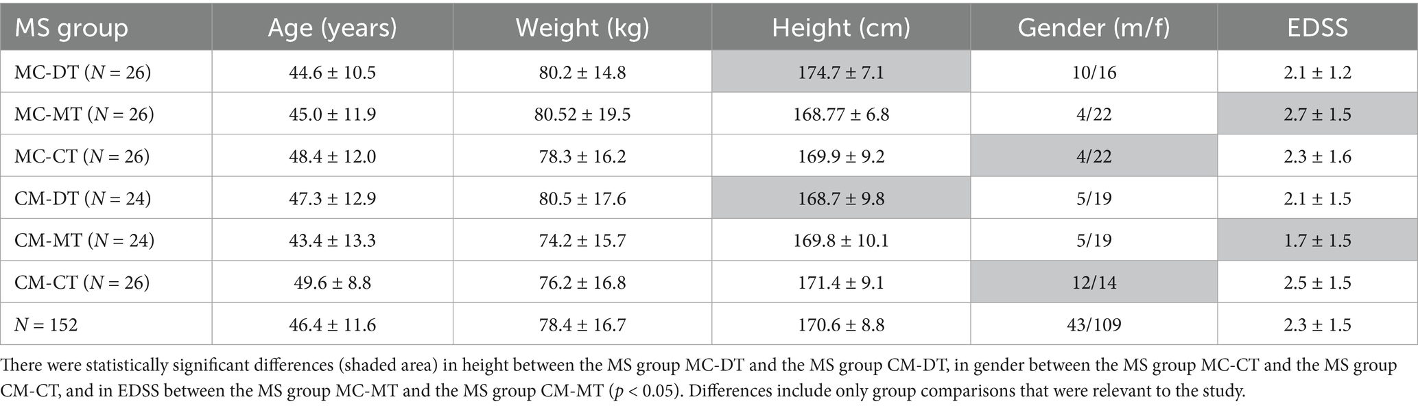 The sample size was estimated for an ANOVA model (repeated-measures, between factors) conducted by means of G*Power 3.1.9.4 software. This a priori power analysis revealed the necessity of 144 participants, given the following input parameters: effect size: F = 0.25; alpha error probability: 0.05; power: 0.8; number of groups: 6; measurements: 3 (see Figure 1). Due to the high standard in patient treatment and management, we do not expect the drop-out rate in the current project to exceed 10%, we hence decided to recruit a total sample of 158 participants. All participants were recruited in the Department of Neurology, Klinikum Bayreuth GmbH, Medical Campus Upper Frankonia, Germany. Out of the 158 PwMS, the data of six participants were excluded due to incorrect IMU measurement data. After all a total of 152 PwMS with an average EDSS of 2.3 (Table 1) were included in this study. The following inclusion criteria applied to the study participants: aged 18–65 years, ability to walk for a minimum of 3 mins without the use of assistive devices. Exclusion criteria were hearing impairment, severe cognitive and motor disorders. All PwMS voluntarily participated in the study and provided their written informed consent after they were fully informed about the research protocol, which was approved by the ethical review board of the Friedrich-Alexander-University Erlangen-Nürnberg, Germany (23-202-B) and was in accordance with the Declaration of Helsinki.
