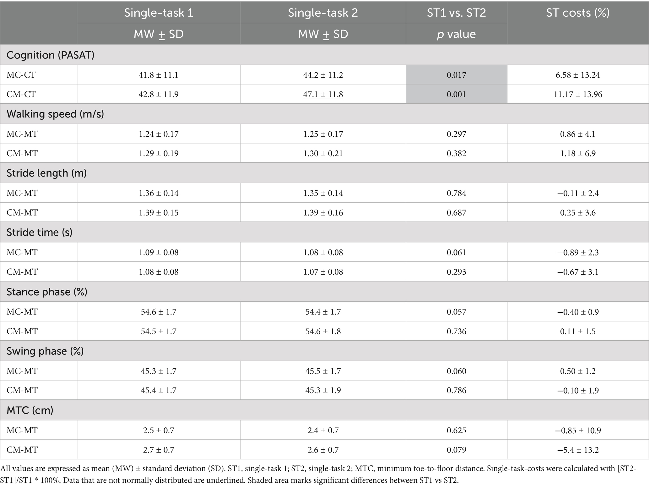 Table 3 contains all measured gait parameters and cognitive assessments under single- and dual-task conditions, separately for the MS groups MC-CT, CM-CT, MC-MT, and CM-MT. Regarding cognitive parameters, PwMS significantly increased their performance. More precisely, in group MC-CT PwMS improved their PASAT result by about 2.4 points and in MS group CM-CT PwMS improved their PASAT result by about 4.3 points (Table 3). Furthermore, gait parameters did not change significantly between both single-tasks neither in group MC-MT nor in group CM-MT (Table 3).