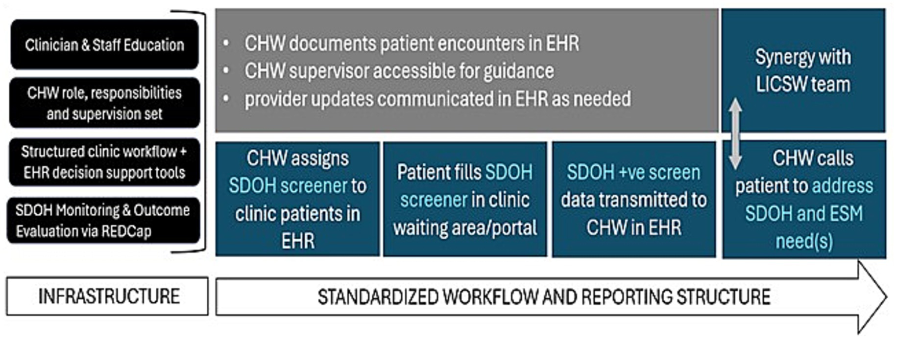 Identifying a primary supervisor may differ amongst epilepsy centers, depending on the availability and suitability of existing team members and CHW infrastructure which may already exist at a given medical center. Irrespective of the individual placed in the supervisory role, the components of a solid infrastructure that includes structured clinic workflow, electronic health record decision support tools, standardized monitoring and evaluation of outcomes will be necessary (Figure 2) in order to integrate a CHW effectively onto an epilepsy center team.