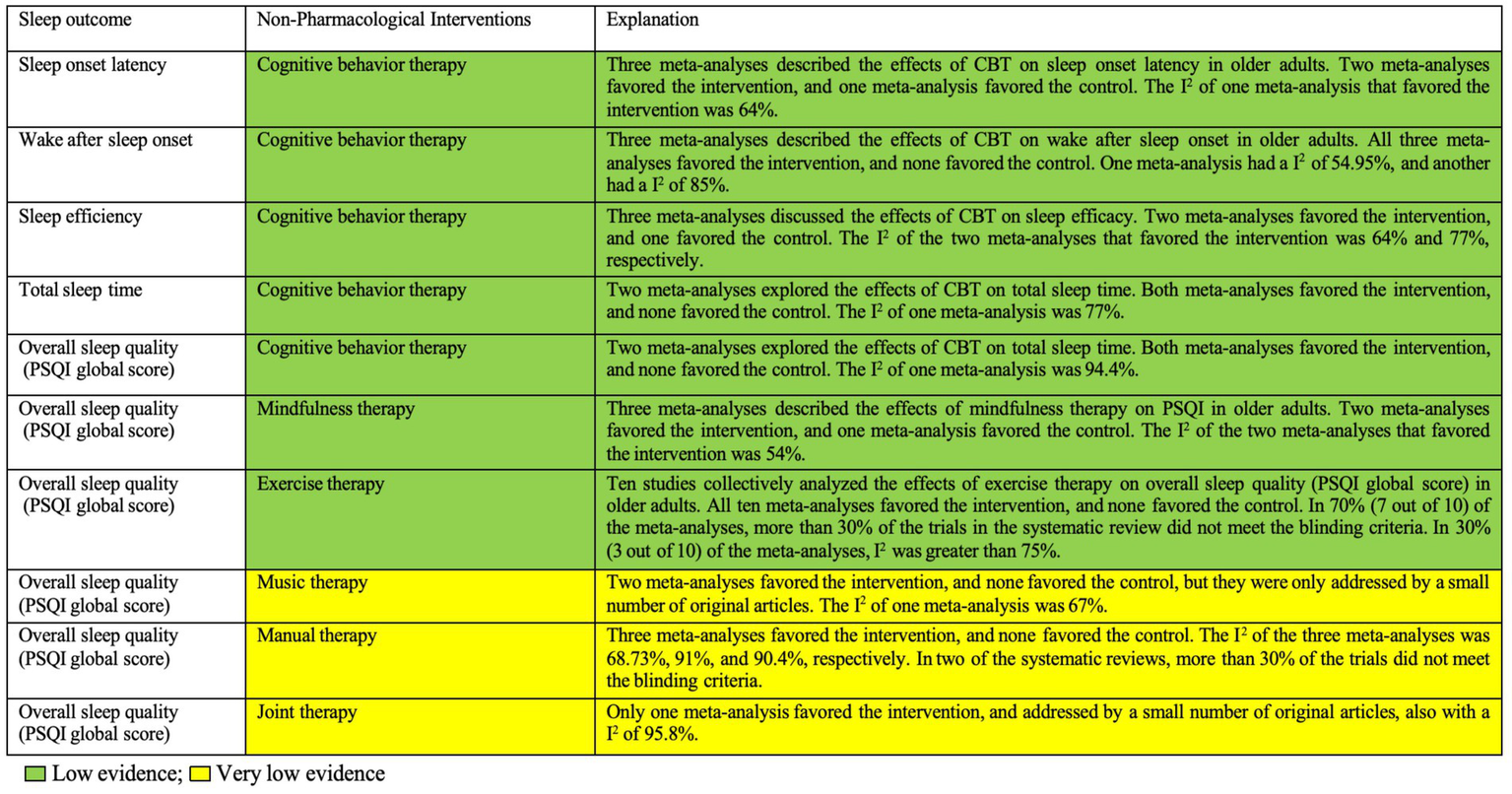 Yu Y, Wang H, Li W, Guo H and Chen Y (2025) Non-pharmacological interventions for sleep in older adults: an umbrella review and evidence map of randomized controlled trials. Front. Neurol. 16:1655192. doi: 10.3389/fneur.2025.1655192