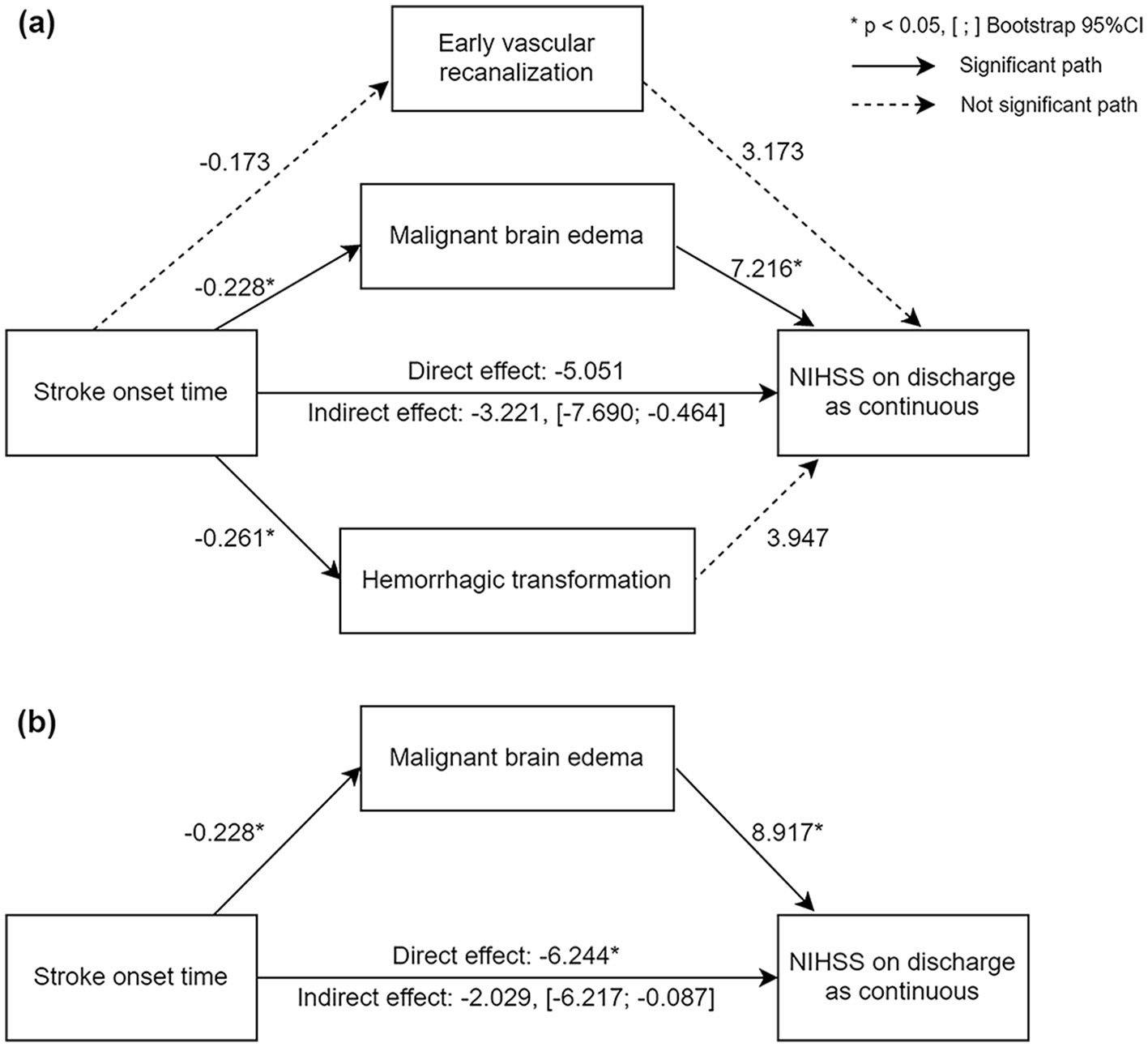 Point-Biserial Correlation analysis was performed to investigate the correlation between discharge NIHSS score and malignant brain edema, HT, and early vascular recanalization. In addition, mediation models were developed to explore the role of malignant brain edema, HT, and early vascular recanalization on the association between onset time and discharge NIHSS score. Indirect effects were estimated with bias-corrected (BC) bootstrapping using 1,000 iterations. All analyses were performed using SPSS (version 25.0; IBM, Armonk, NY, USA) and Amos (version 26.0.0; IBM, Armonk, NY, USA) software. P < 0.05 was considered statistically significant. The significance of the BC bootstrap estimate was indicated by confidence intervals (CI) that did not contain 0 (17).
