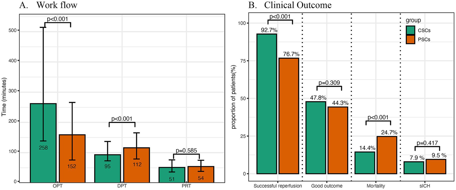 Results: From November 2021 to December 2022, 1,196 patients were enrolled, and 847 were included in the analysis. Overall, 84.8% of patients achieved successful reperfusion, and 46.3% achieved good clinical outcomes. Compared with patients treated at CSCs, those treated at PSCs had shorter onset-to-presentation time (OPT: 152 min vs. 268 min, p < 0.001) but longer door-to-puncture time (DPT: 112 min vs. 95 min, p < 0.001). Successful reperfusion rates were lower in PSCs (76.6% vs. 91.0%, p < 0.001), and mortality was higher (24.7% vs. 14.4%, p < 0.001). However, good clinical outcomes were similar between the two groups (44.3% vs. 47.8%, p = 0.309).