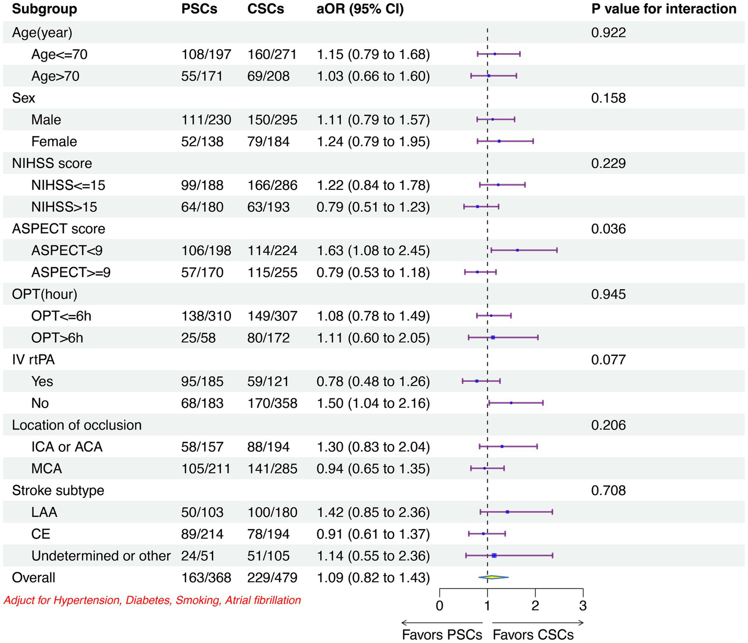 Figure 4. Subgroup analyses of the primary outcome between two stroke centers. CSCs indicated comprehensive stroke centers; PSCs, primary stroke centers; OR, odd ratio; CI, confidence interval; NIHSS, National Institutes of Health Stroke Scale; ASPECT, Alberta Stroke; OPT, onset-to-puncture time; IV, intravenous; rtPA, recombined tissue plasminogen activator; ICA, intracranial carotid artery; ACA, anterior cerebral artery; MCA, middle cerebral artery; LAA, large artery atherosclerosis; CE, cardia embolism.