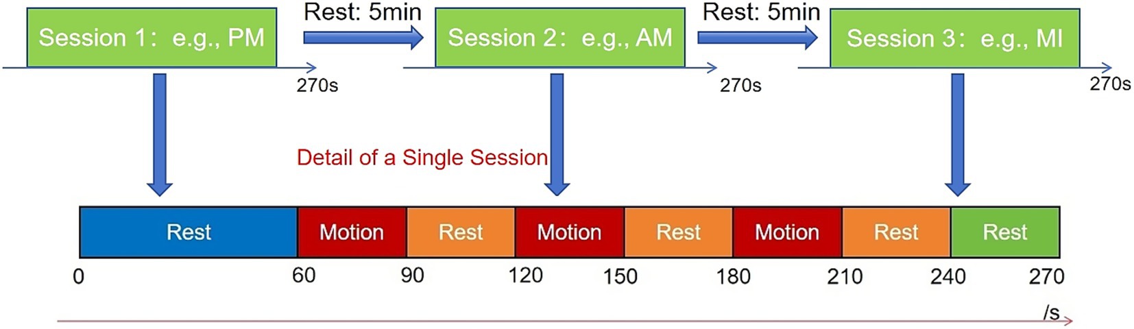 Figure 1. Schematic of the complete experimental protocol for the block-designed motor task. The upper section illustrates the sequence of the three experimental sessions (e.g., AM, PM, and MI), which were performed by each participant in a randomized order. A 5-min rest interval was implemented between consecutive sessions; the lower section details the structure of a single session. Each session began with a 60-s initial rest period, then contained three 30-s task execution periods (all involving repetition of the same movement), interspersed with 30-s rest periods, and concluded with a final 30-s rest period. Each session had a total duration of 270 s.