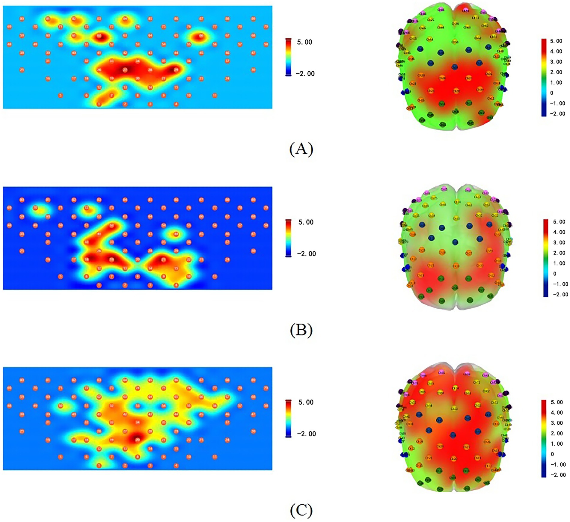Figure 3. Brain activation topographies of three motor therapies (one-sample t-test, FDR-corrected). (A) AM: 2D (left) and 3D (right) topographies of Δ[HbO] activation; (B) PM: 2D (left) and 3D (right) topographies of Δ[HbO] activation; (C) MI: 2D (left) and 3D (right) topographies of Δ[HbO] activation. All topographic maps share an identical color scale, with the activation intensity represented on a uniform numerical range from −2 to 5. Red indicates strong positive activation, while blue indicates weak activation or deactivation.