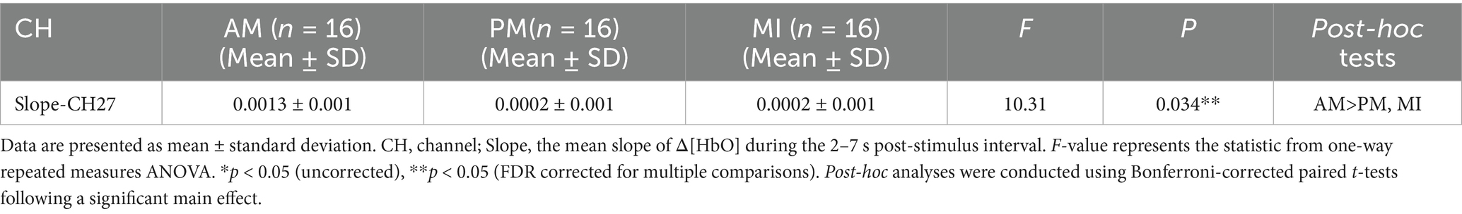 In fNIRS data, the slope parameter reflects the rate of Δ[HbO] concentration changes during tasks and can be used to evaluate the rapidity of brain activation. One-way repeated measures ANOVA showed significant between-group differences in specific channels (Figure 5A, Table 3). Specifically, channel 27 in the left DLPFC showed significant differences in mean slope values among the three therapies (F = 10.31, p = 0.034, FDR-corrected). Post-hoc multiple comparisons showed AM had a significantly higher slope than PM and MI (Figure 5B, Table 3).