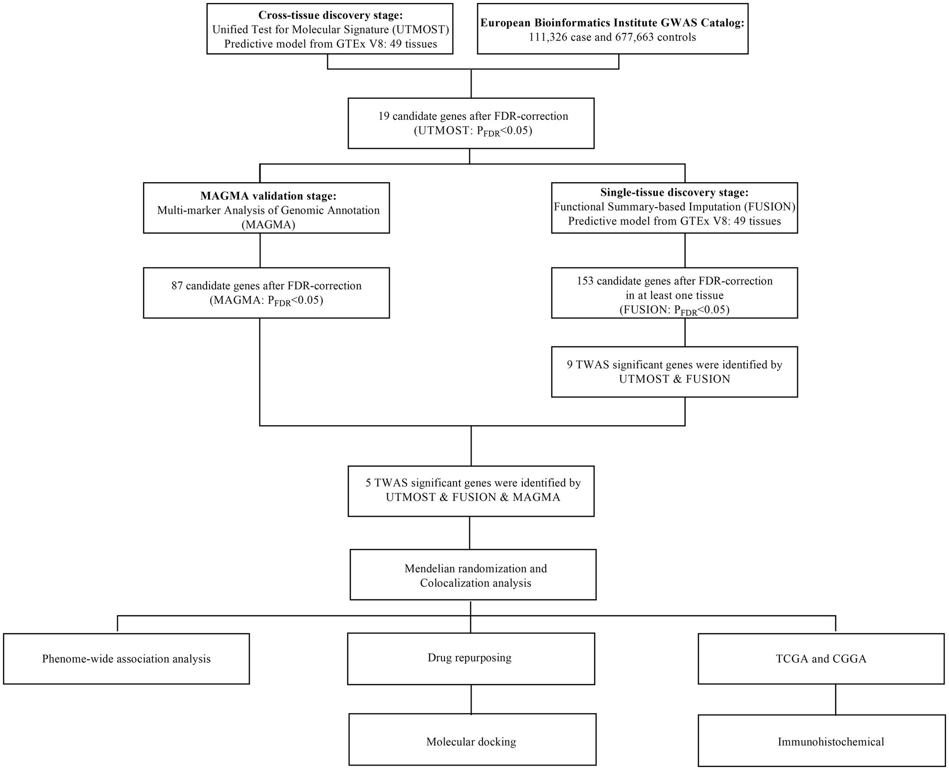 Figure 1. The flowchart of this study. GWAS, genome-wide association; GTEx, Genotype-Tissues Expression Project; TWAS, transcriptome-wide association studies; UTMOST, unified test for molecular signatures; FUSION, functional summary-based imputation; MAGMA, multi-marker Analysis of GenoMic Annotation; TCGA, The Cancer Genome Atlas; CGGA, Chinese Glioma Genome Atlas.