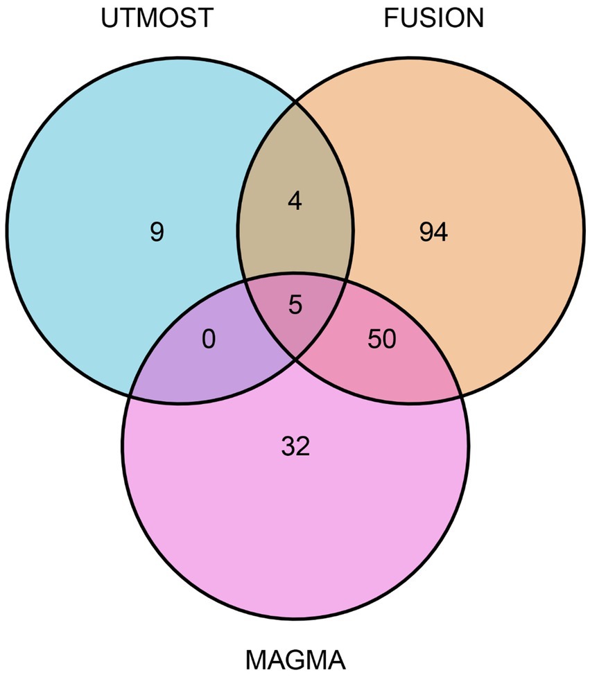 Figure 2. Venn diagram. MAGMA identified 87 significant genes associated with glioma, FUSION identified 153, and UTMOST cross-tissue analysis identified 18.