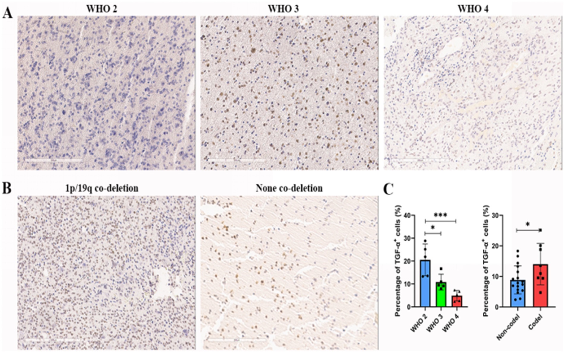 Figure 4. Association between TGFA immunoexpression and clinicopathological features in glioma cases. (A) Representative images of IHC staining of TGFA index in glioma samples across distinct grades. (B) Representative images of IHC staining of TGFA index in glioma samples across 1p/19q chromosomal deletion status. (C) Results of the percentage of TGF-α+ cells of TGFA in distinct grades and 1p/19q chromosomal deletion status. *p < 0.05; **p < 0.01; ***p < 0.001.
