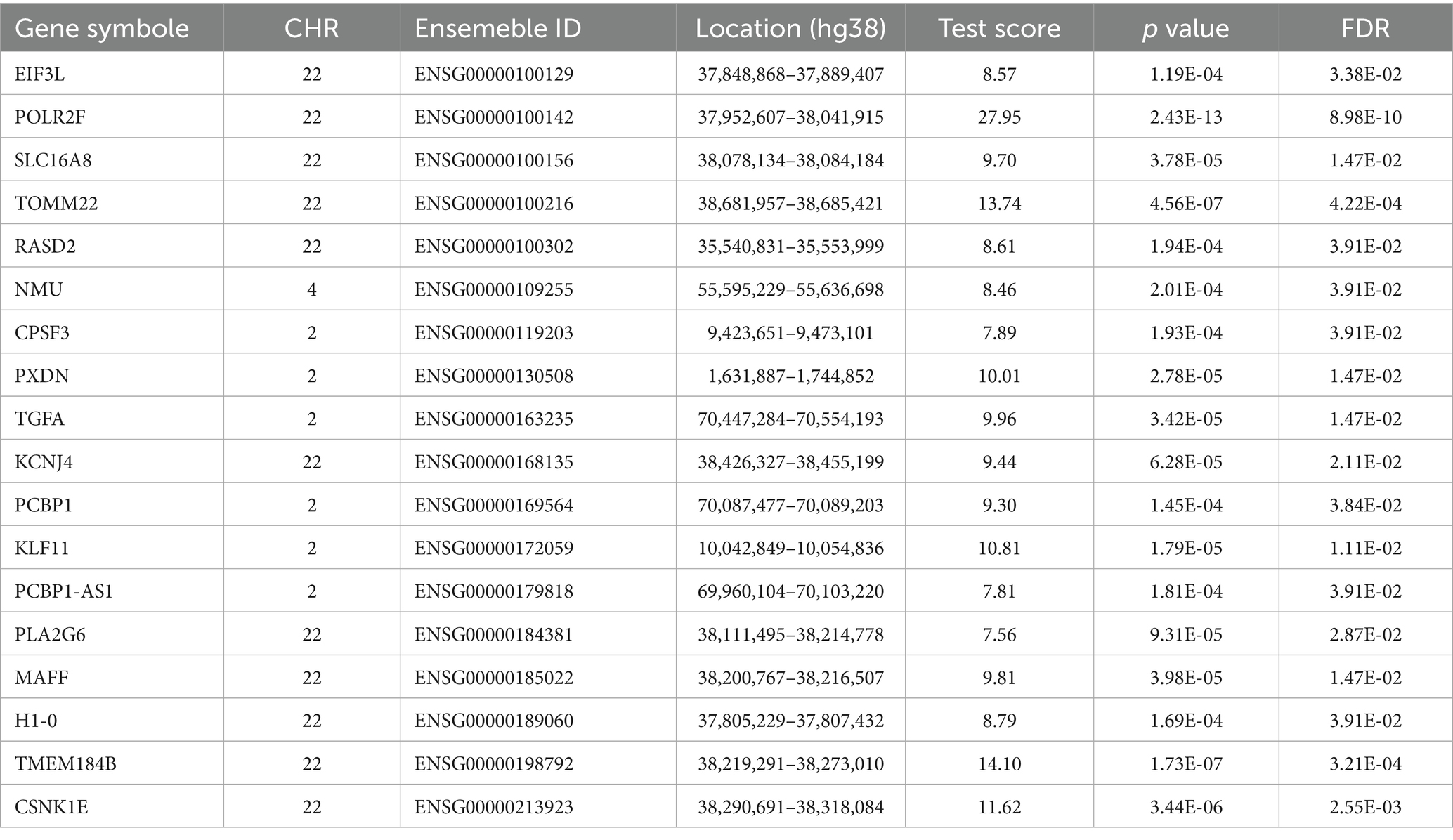 TWAS studies conducted through both cross-tissue and single-tissue analytical frameworks identified distinct sets of genes associated with glioma susceptibility. The cross-tissue analysis revealed 218 genes with nominal significance (p < 0.05; Supplementary Table S1), of which 18 remained significant after FDR adjustment (FDR < 0.05; Table 1). Parallel analysis in individual tissues confirmed that 153 genes achieved FDR < 0.05 in at least one tissue type (Supplementary Table S2). A subset of 9 protein-coding genes, POLR2F, SLC16A8, CPSF3, PXDN, TGFA, PLA2G6, MAFF, TMEM184B, and CSNK1E, met statistical criteria in both analysis models, indicating that they are reliable and high-confidence candidate genes for glioma susceptibility.